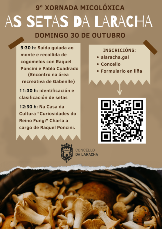 O Concello organiza a novena edición da xornada de iniciación á micoloxía As setas da Laracha que se celebrará o domingo día 30 de outubro. Do mesmo xeito que en anteriores ocasións, farase en colaboración de Raquel Poncini e Pablo Cuadrado.