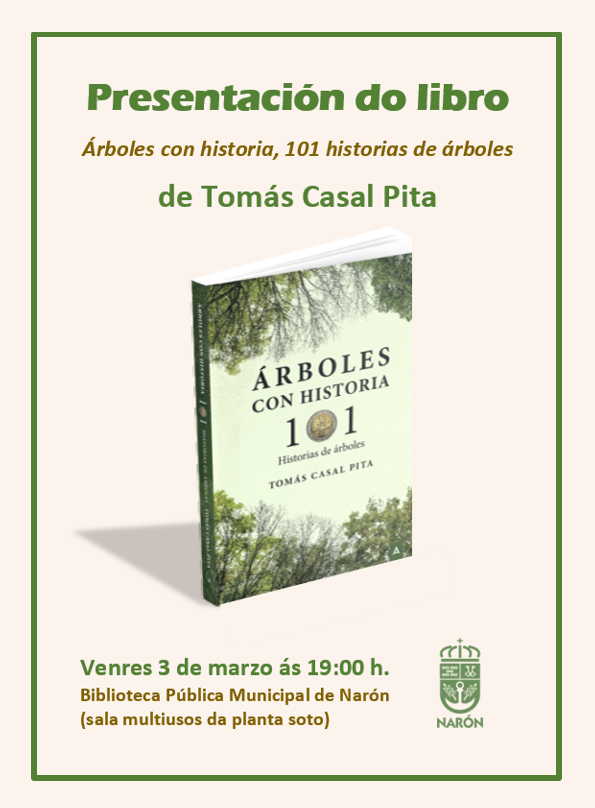 A sala multiusos da Biblioteca municipal acollerá este venres, día 3, a presentación do libro “Árbores con historia, 101 historias de árboles”, do escritor Tomás Casal. A cita, tal e como avanzou a edil de Bibliotecas, Mercedes Taibo, será ás 19.00 horas e no transcurso da mesma o autor dará a coñecer a súa nova obra, unha colección de 101 pezas narrativas que vinculan unha serie de árbores coa historia da propia humanidade. A entrada é libre ata completar a capacidade da sala.