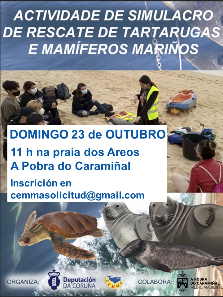 A Concellaría do Medio Ambiente da Pobra do Caramiñal, da cal é titular a edil Genoveva Hermo (Nós Pobra), organiza para o día 23 de outubro unha actividade de simulacro de rescate de tartarugas e mamíferos mariños impartida por persoal especializado da Coordinadora para o Estudo dos Mamíferos Mariños (CEMMA). Desenvolverase na praia dos Areos, na súa parte próxima ao pantalán, dende as 11.00 ata as 13.00 horas. En caso de chuvia, trasladarase á Casa Mariñeira, situada nas inmediacións do parque do Castelo.