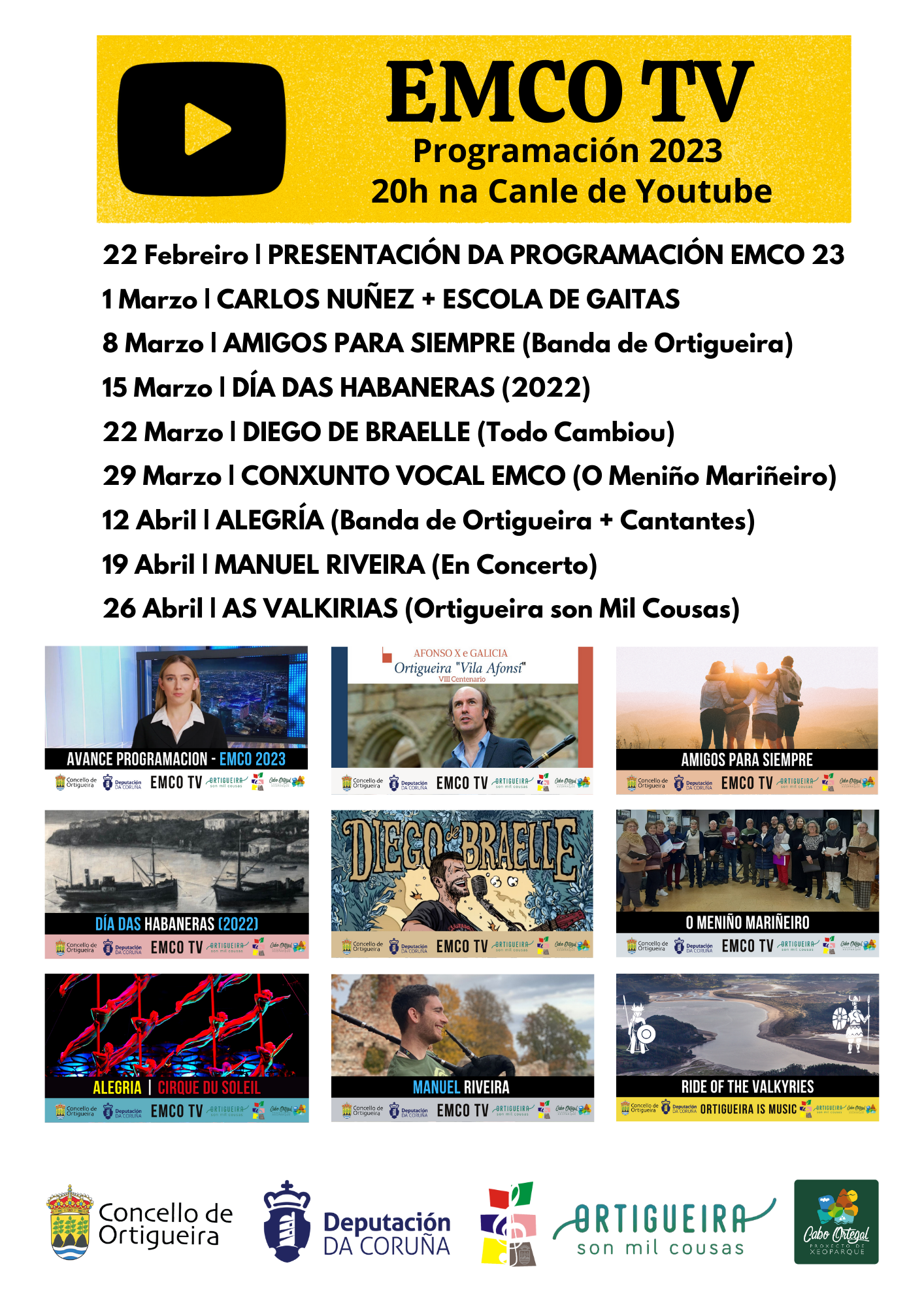 O 1 de marzo iníciase a programación coa actuación de Carlos Núñez xunto á Escola de Gaitas, que tivo lugar o mes de setembro na igrexa de Santa Marta; o 8 de marzo poderase ver a interpretación de Amigos para sempre por parte da Banda de Ortigueira; o día 15 emitirase o Festival de Habaneras do ano 2022, o 22 de marzo emitirase o tema de Diego de Braelle, “Todo cambiou”, o 29 de marzo o Conxunto Vocal de EMCO interpretará a canción “Ou meniño mariñeiro”, o 12 de abril a Banda de Ortigueira e algúns cantantes interpretarán a canción “Alegría”, o 19 de abril actuará Manuel Riveira e o 26 de abril pecharase a programación co vídeo turístico promocional de “As Valkirias”.