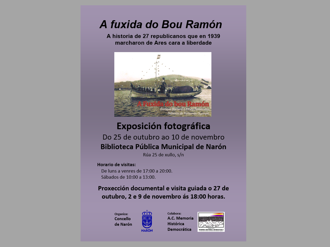 Este mesmo xoves, ás 18.00 horas, proxectarase o documental “A fuxida do bou Ramón” e a continuación haberá unha visita guiada á exposición na que participará persoal da Asociación Memoria Histórica Democrática, que ofrecerá máis datos sobre estes feitos históricos. “A fuxida do bou Ramón” conta a historia da fuga de 27 persoas da comarca de Ferrol, dende Ares, no ano 1939 disfrazados de Gardas Civís, un falanxista e varios presos, todos eles republicanos. Marchan tralo trunfo franquista planeando unha fuxida temeraria no barco “bou Ramón”, coa complicidade dos seus dez tripulantes e con rumbo ao sur de Inglaterra. Todos eles desembarcaron no porto francés da Rochelle pero as autoridades francesas encerráronos no campo de concentración de Barcarès, con milleiros de exiliados republicanos. As represalias sufríronas en Galicia as súas familias.