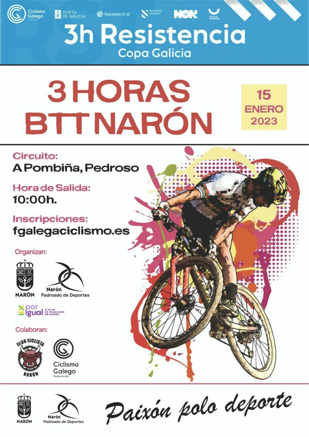 A “II BTT Resistencia Cidade de Narón” levarase a cabo en Pedroso, nun circuíto circular de oito quilómetros con saída e meta na pista polideportiva da citada parroquia. Disputaranse, tal e como indicou José Luis Fernández as categorías de cicloturismo, élite, élite feminino, junior, junior feminino, master 30, 40, 50 e 60, tamén masculino e feminino, parellas masculino e feminino, parellas mix, sub 23 e sub 23 feminino. “É unha disciplina que existe por segundo ano en Galicia a nivel federado e na que o ano pasado participaron de media unhas 300 persoas, polo que estamos moi ilusionados dende a Federación Galega e moi agradecidos polo apoio do Concello de Narón ao ciclismo”, destacou Fernández.