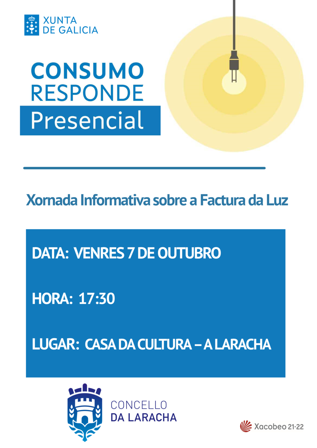 Persoal técnico do Instituto Galego de Consumo e da Competencia impartirá na Laracha nos dous próximos venres sendas xornadas informativas presenciais sobre a factura eléctrica e os servizos financeiros que van dirixidas á poboación en xeral.