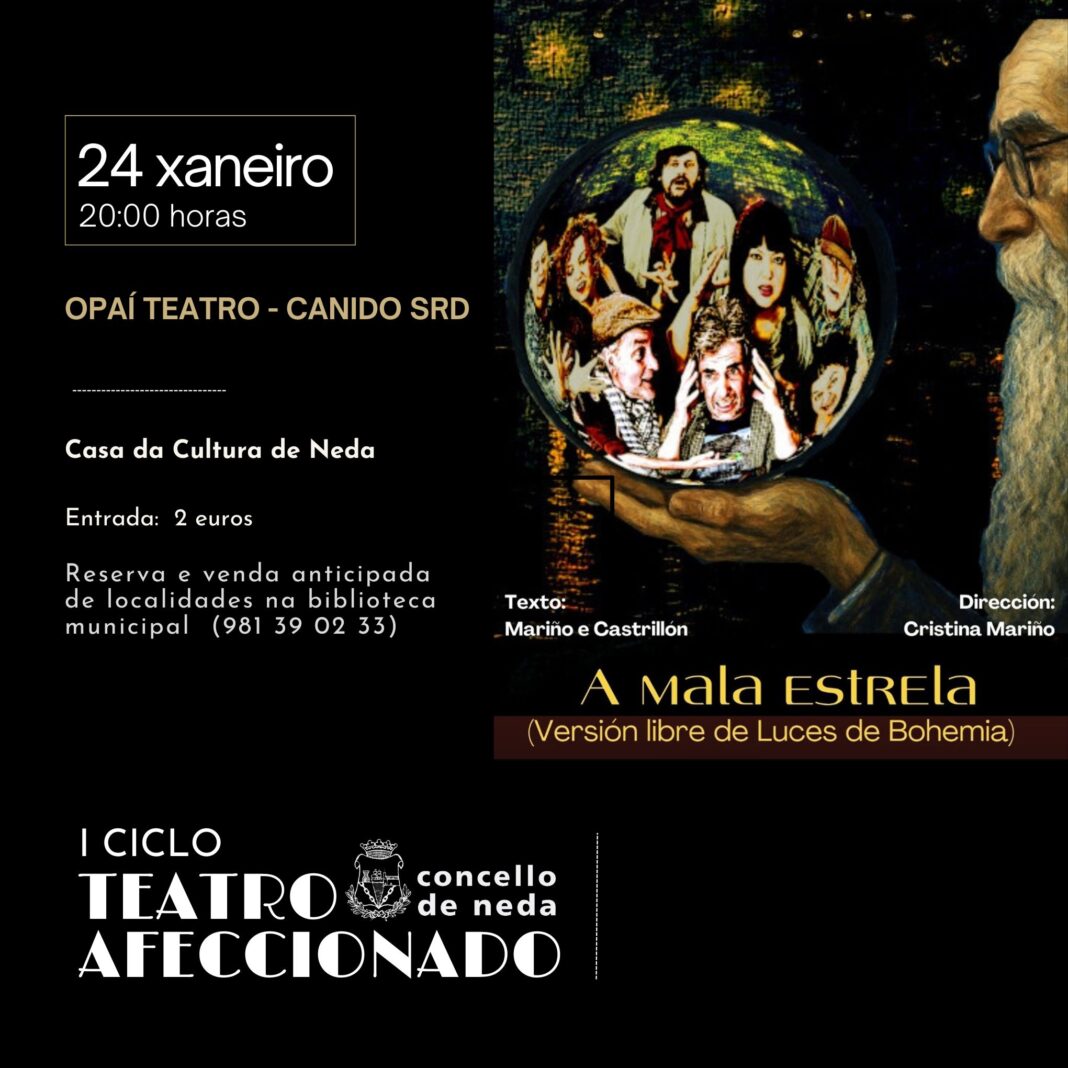 Segunda entrega do I Ciclo de Teatro afeccionado Concello de Neda. Tras o éxito das “Bacantes”, este sábado. 24 de xaneiro, a partir das 20 horas, a compañía ferrolá Opaí teatro- SDR Canido pon en escena “A mala estrela”, primeira versión galega libre da que para moitos é a obra mestra de Valle Inclán, “Luces de bohemia”. Comeza a reserva e venda anticipada de entradas.