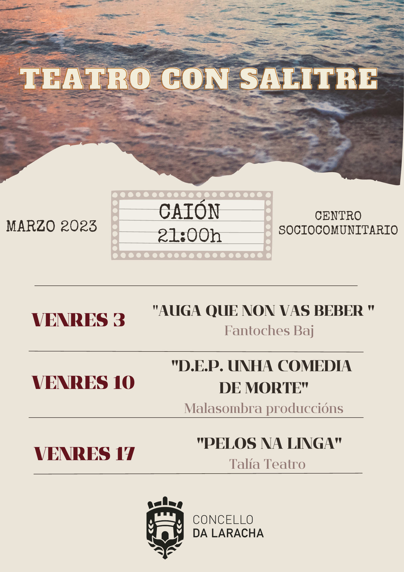 Esta segunda edición do programa Teatro con salitre constará de tres funcións a celebrar os venres 3, 10 e 17 de marzo no centro sociocomunitario de Caión, todas elas a partir das 21:00 horas, con entrada libre e gratuíta, e dirixidas ao público xuvenil e adulto (a partir de 13 anos de idade).
