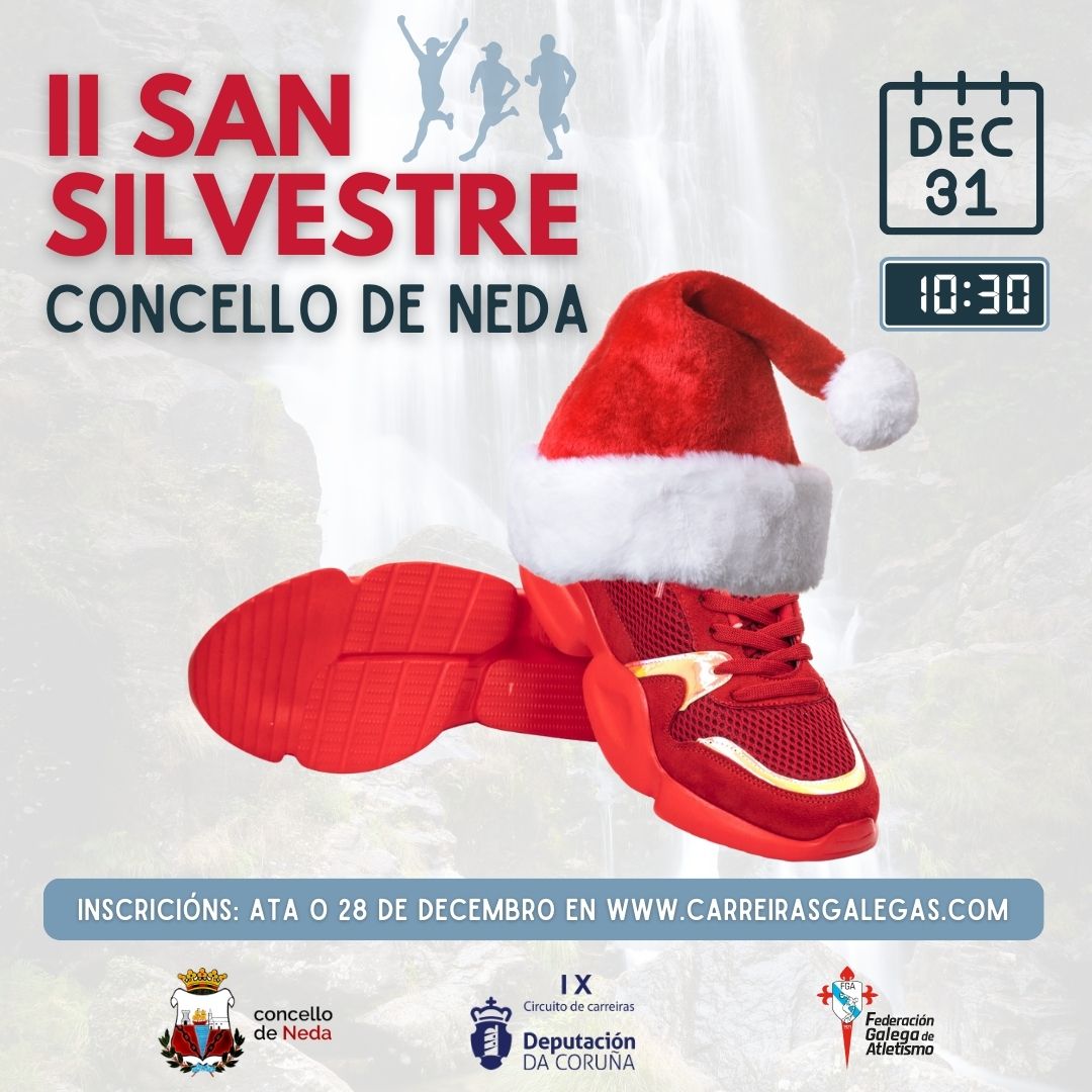 No marco da programación de Nadal, o Concello de Neda organiza este ano a súa segunda San Silvestre. A cita terá lugar o domingo 31 de decembro as 10:30 h, con saída e chegada na pista polideportiva do Roxal. A proba, pertencente ao calendario oficial da Federación Galega de Atletismo, e incluída no “IX Circuíto da Deputación da Coruña”, vén de abrir o seu prazo de inscrición.