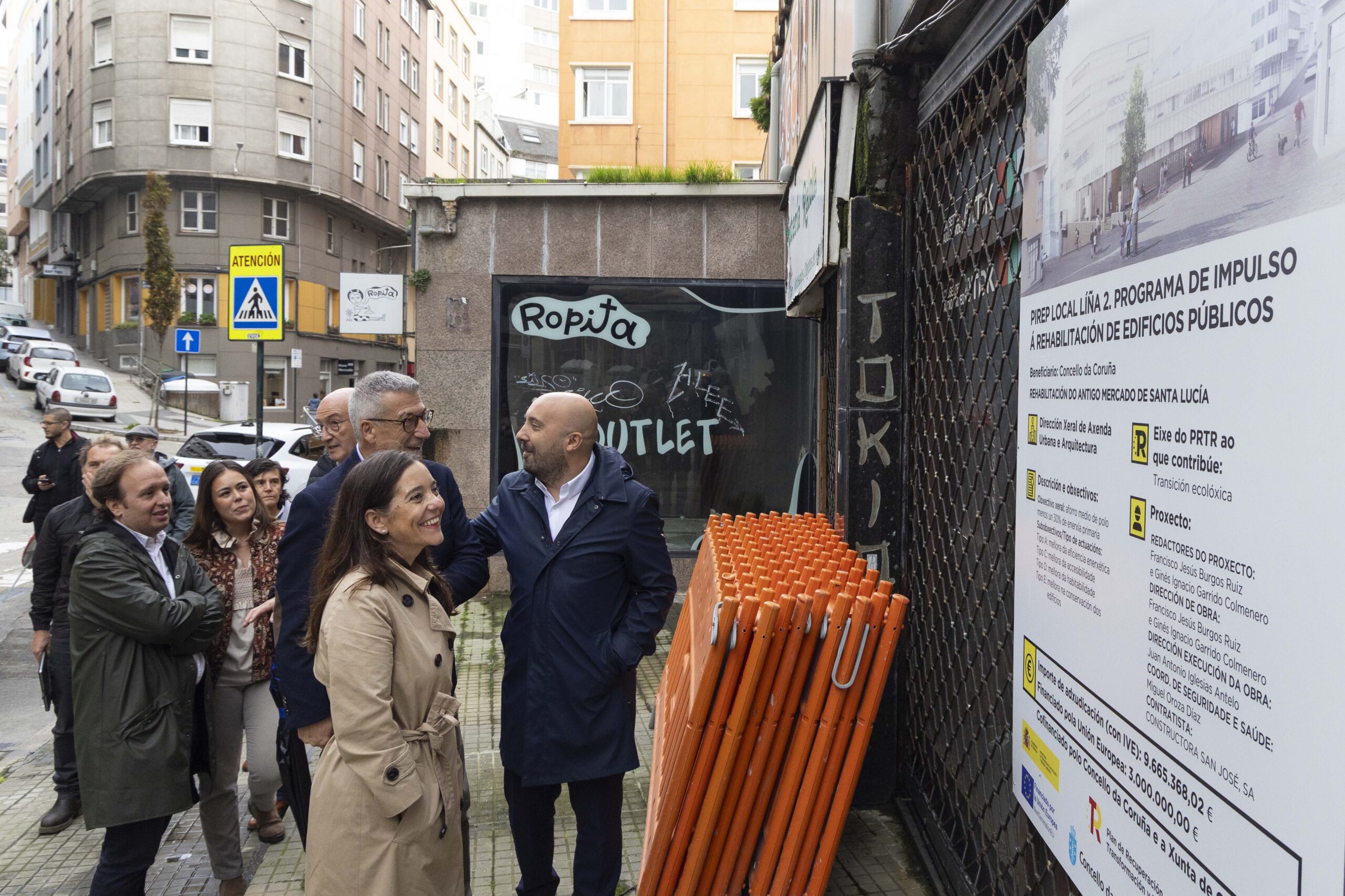 A rehabilitación de Santa Lucía conta cun orzamento de 9,6 millóns de euros, cofinanciado entre o Concello e a Xunta. Rey lembrou que case a metade do investimento sairá das arcas municipais, grazas á captación de case tres millóns en fondos europeos PIREP por parte do Goberno local.