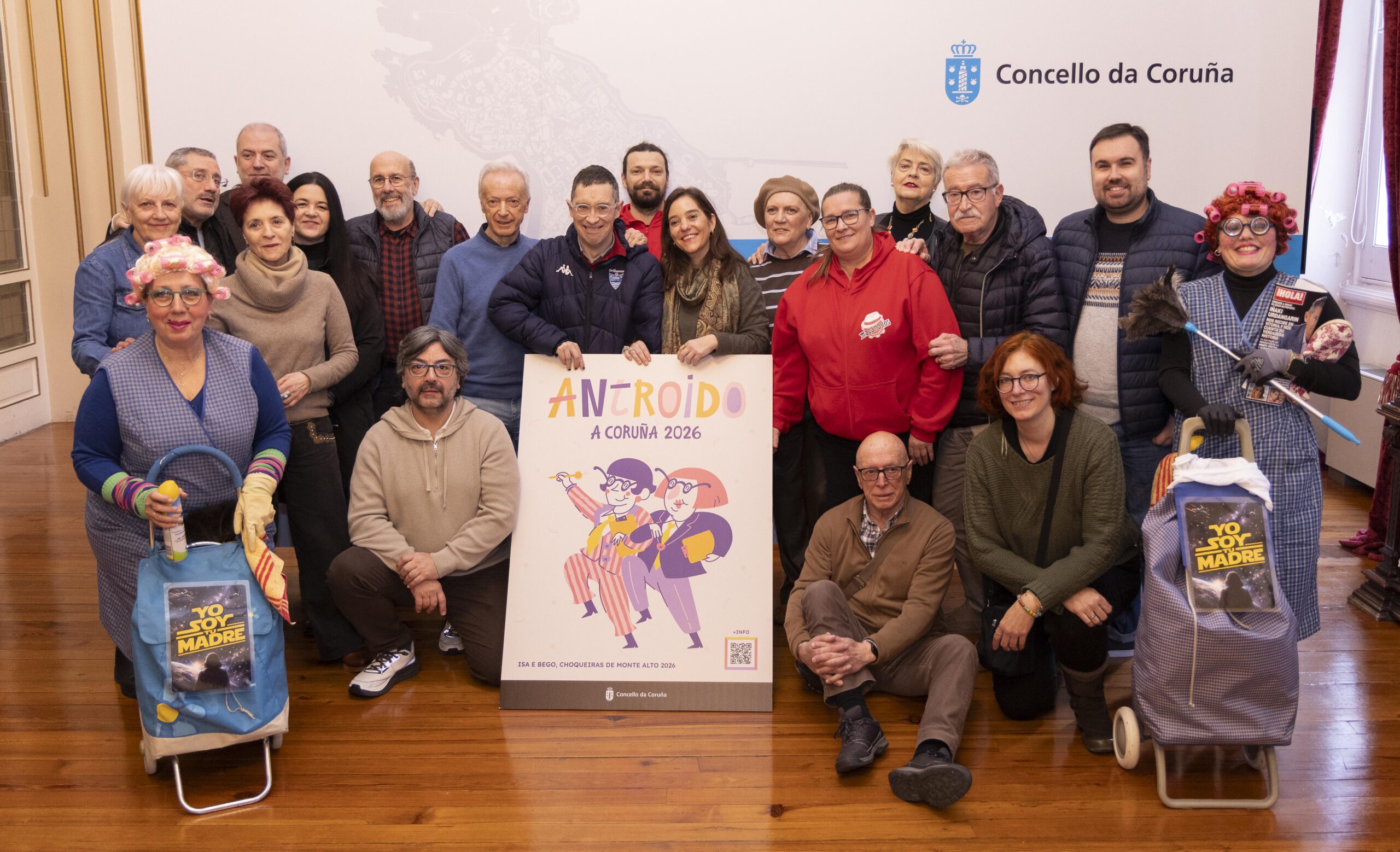A alcaldesa, Inés Rey, presentou este martes a imaxe e a programación do Antroido da Coruña deste ano 2026. Continúase coa temática aberta o pasado 2025 e o cartel destas festas volve a estar dedicado ao choqueiro ou choqueira do ano, neste caso choqueiras. Este ano o recoñecemento foi para Bego e Isa. Xunto á alcaldesa, descubriron esta mañá o cartel nun acto en María Pita, onde tamén participaron o concelleiro de Cultura e Turismo, Gonzalo Castro, así como representantes das diferentes comparsas da cidade.