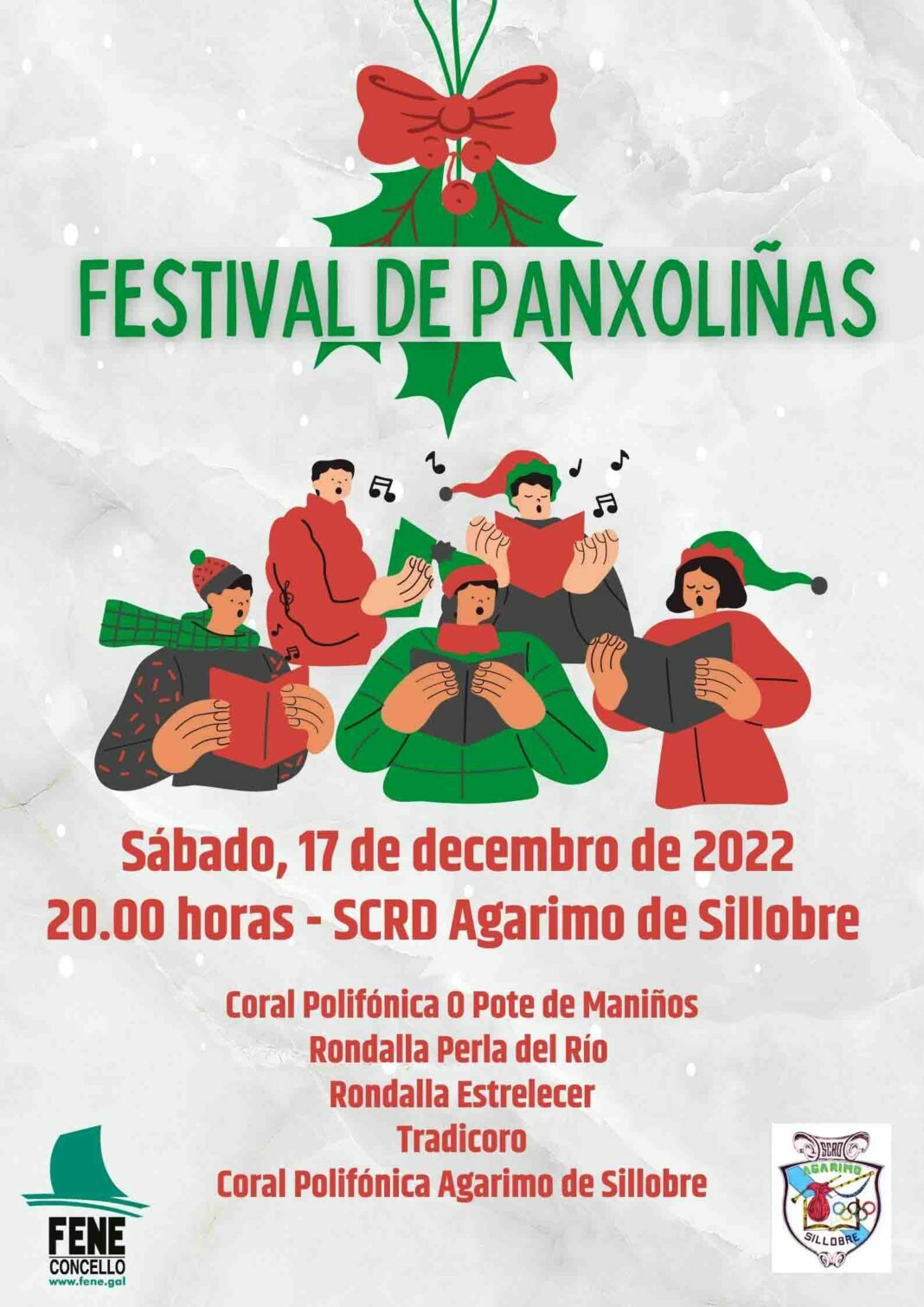 A sociedade Agarimo de Sillobre acolle este sábado, ás 20 horas, o XX Festival de Panxoliñas no que tomarán parte as cinco formacións locais que interpretarán os clásicos tradicionais destas datas. No encontro musical, o primeiro que se celebra tralo inicio da pandemia, participarán a Coral Polifónica O Pote de Maniños, a rondalla Perla del Río, a rondalla Estrelecer, o Tradicoro e, como anfitrioa, a coral Polifónica Agarimo de Sillobre.