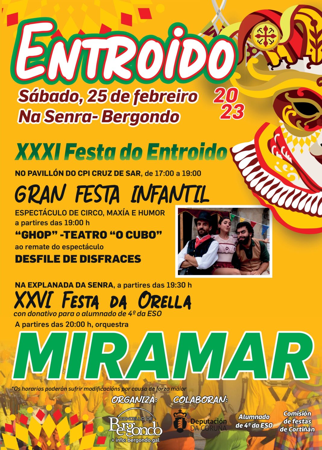 O Concello de Bergondo celebra mañá, sábado 25 de febreiro o seu XXXI Festa do Entroido e a XXVI Festa dá Orella, unha tradición que este ano inclúe na súa programación desfile de disfraces, música, xogos para os máis pequenos e animación.
