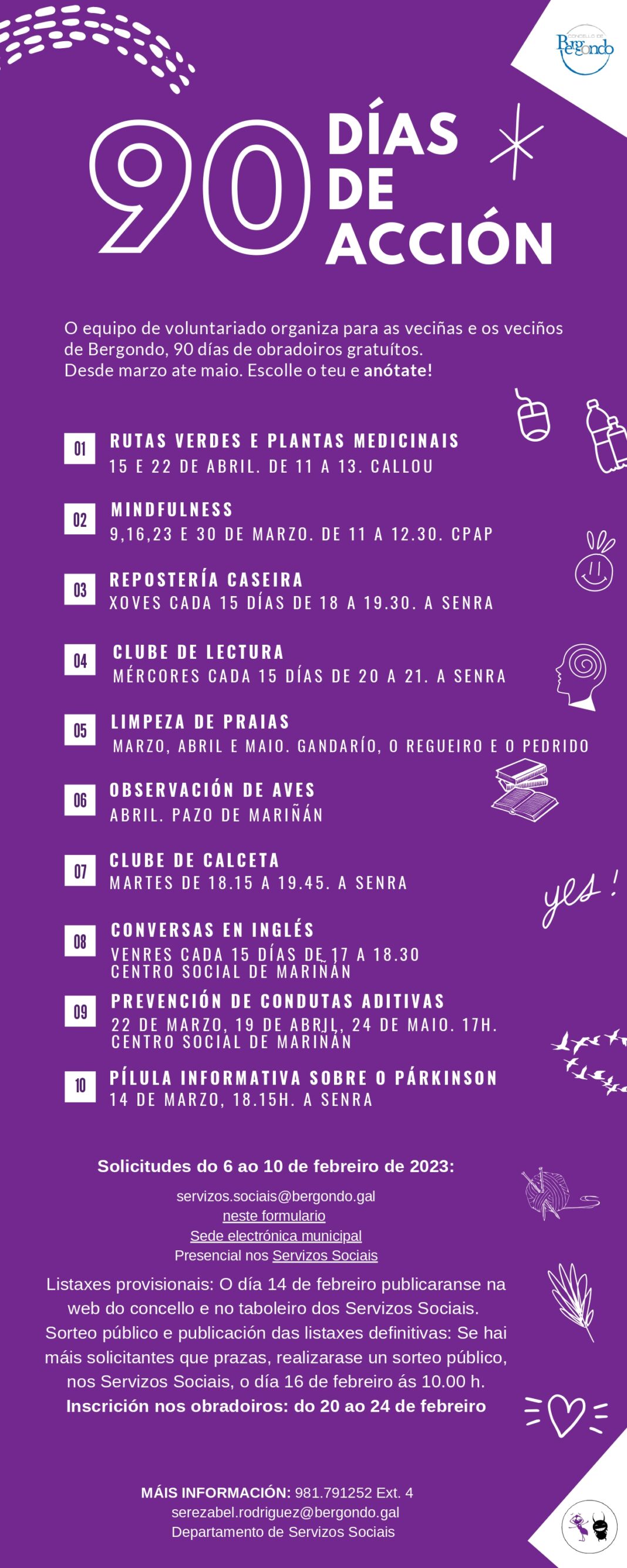 O Concello de Bergondo lanza o programa ‘90 días de acción’, unha iniciativa impulsada polo equipo de voluntariado municipal, que ofrece aos veciños e veciñas a posibilidade de participar, durante noventa días, en diferentes obradoiros gratuítos.