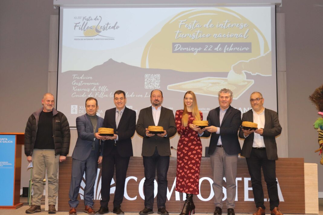 O alcalde de Boqueixón, Ovidio Rodeiro; e o presidente da Asociación Cultural da Filloa, Juan Manuel Silva Hermida, presentaron esta mañá no CIFP Compostela o programa da 43 edición da Festa da Filloa de Lestedo, cuxo día grande terá lugar o domingo 22 de febreiro. Un acto no que estiveron acompañados polo conselleiro de Educación, Ciencia, Universidades e Formación Profesional, Román Rodríguez González; o director da Axencia de Turismo de Galicia, José Manuel Merelles Remy; o deputado provincial de Contratación, Patrimonio e Equipamento, Xosé Luís Penas Corral; o director do CIFP Compostela, Ramiro Esparís Sampedro; e a actriz e presentadora María Mera.
