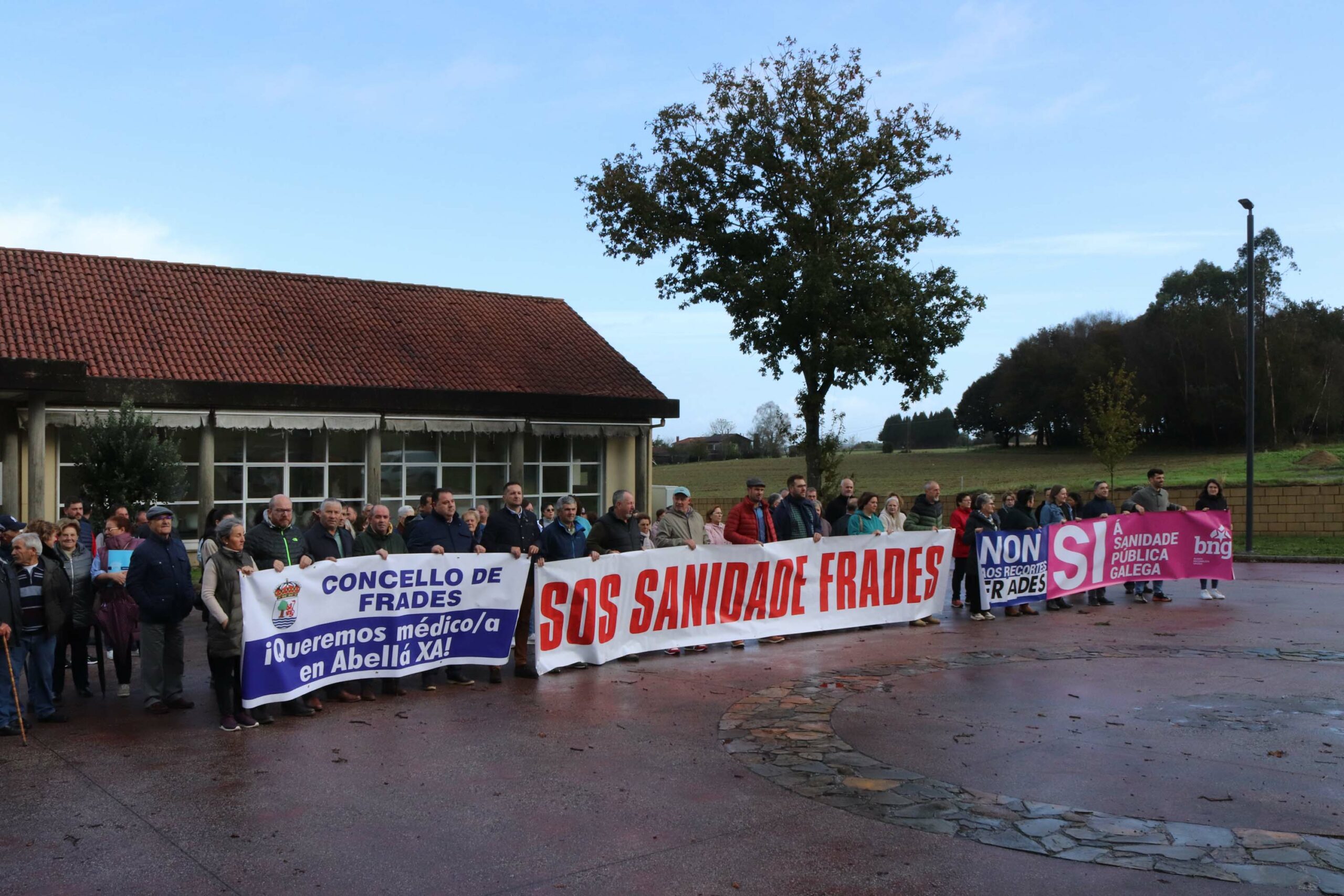 Á fronte da concentración, tres pancartas, unha por cada grupo municipal. O grupo socialista repetiu mensaxe: “SOS Sanidade Frades”; mentres que o grupo de Goberno cambiou a súa pancarta por “Concello de Frades: queremos médico/a en Abellá xa!”; e o BNG debutaba cunha pancarta a dúas cores: “Non aos recortes. Si á sanidade pública galega”.