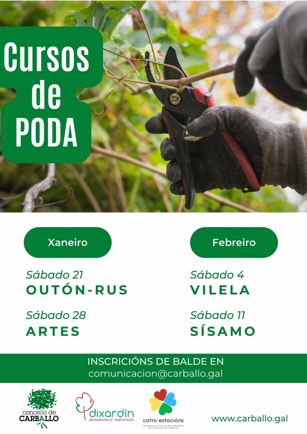 Despois do éxito acadado o ano pasado en Verdillo, o Concello de Carballo e Dixardín volven a colaborar na organización de cursos de poda. Este ano serán catro en total, e realizaranse en catro parroquias diferentes para intentar achegar a formación a todo o territorio. Apuntade as datas e os lugares: