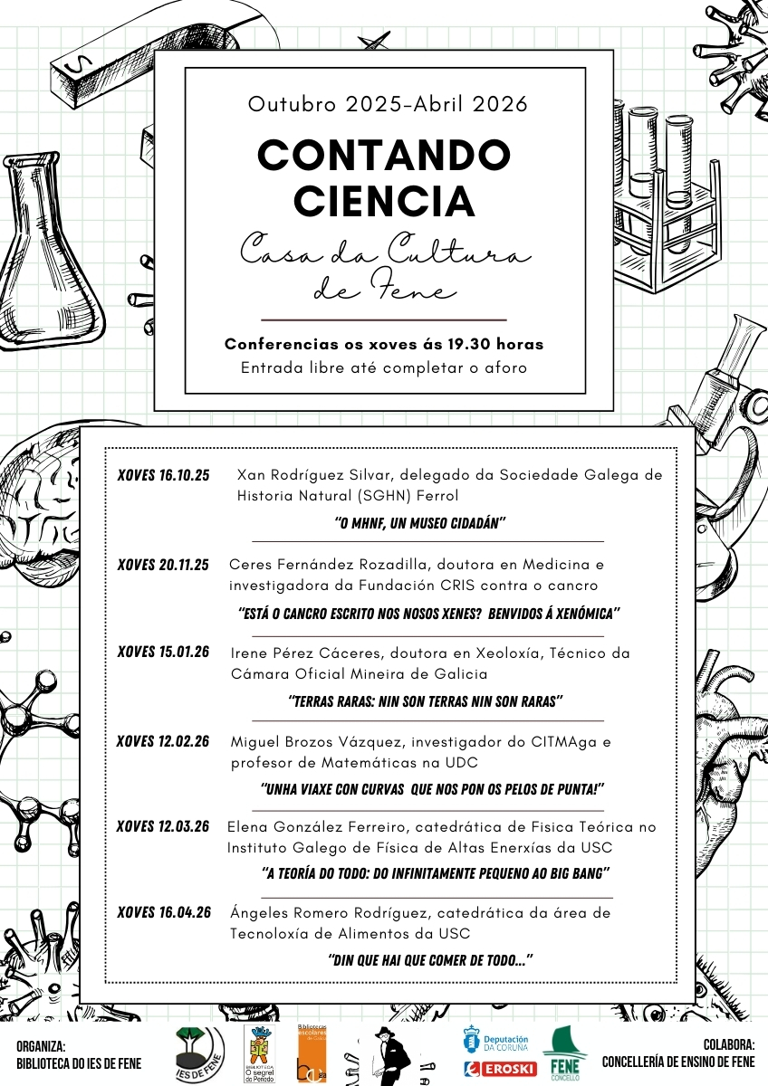 A conferencia, enmarcada no ciclo Contando Ciencia, será este xoves 12 de febreiro, ás 19.30 horas, no salón de actos da Casa da Cultura con entrada libre e gratuíta. Ciclo organizado pola Biblioteca O Segrel do Penedo do IES de Fene coa colaboración da Concellería de Ensino de Fene e baixo a coordinación da mestra Violeta Miraz Seco.