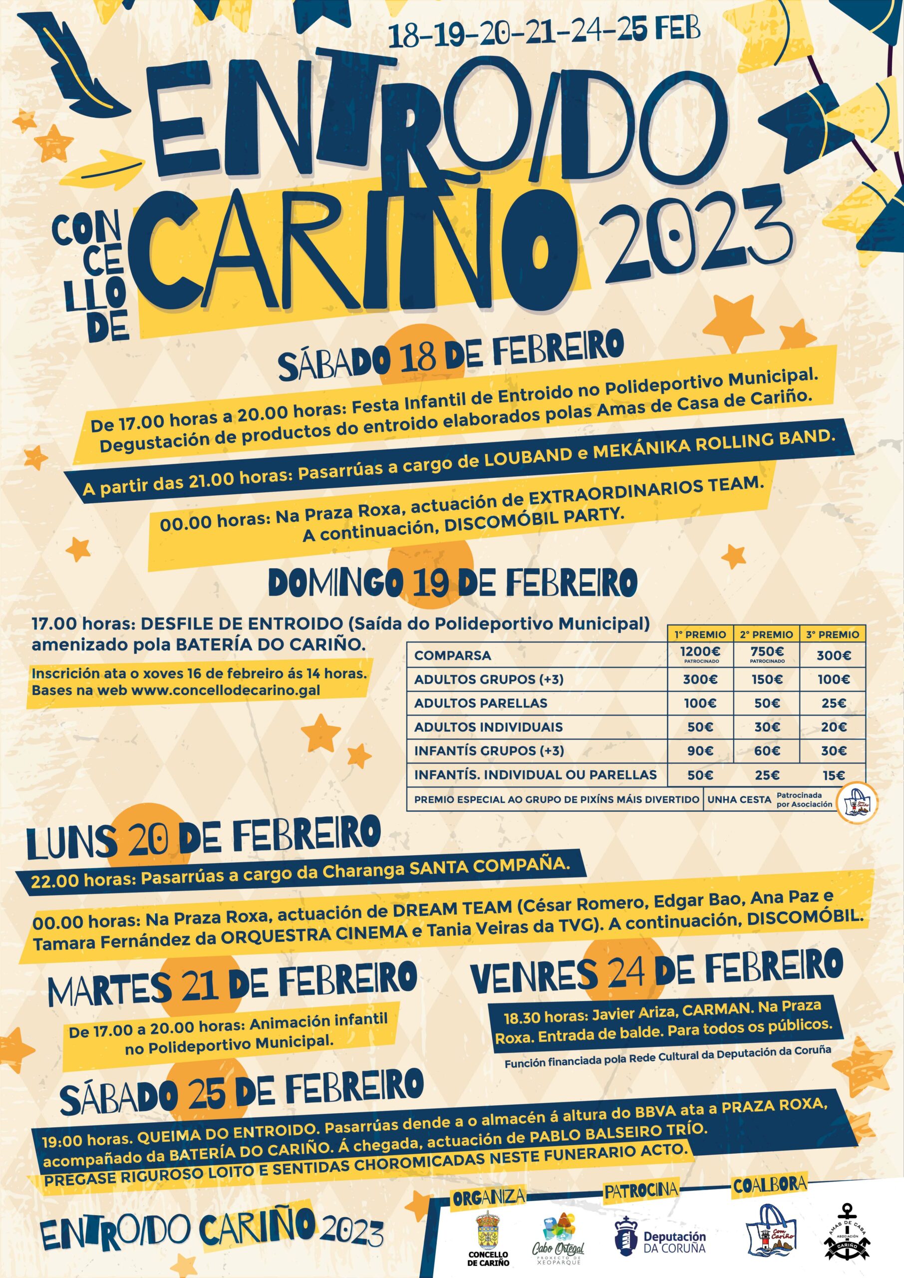 O Concello de Cariño publicou a programación de actividades para o Entroido 2023, que se celebrará durante os días 18, 19, 20, 21, 24 e 25 de febreiro e que inclúe diferentes opcións de lecer, que van desde as festas e animación para os máis pequenos ou os concertos ao teatro rueiro e ao tradicional desfile.