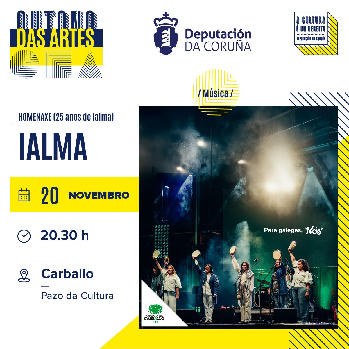 Carballo acolle unha semana de sons tradicionais, jazz, teatro ou de honra a Santa Cecilia no Novembro con Música. Xa o xoves 20 de novembro o programa viaxa ao ámbito da música folk da man de IALMA. Aínda que residen en Bruxelas, Verónica, Natalia, Marisol e Eva, as compoñentes do grupo, manteñen unha conexión permanente coa súa terra natal, Galicia. Durante 25 anos, a cultura musical e as tradicións galegas foron as súas inesgotables fontes de inspiración, que lles permitiron construír, pouco a pouco, un repertorio de cancións tomadas das súas raíces pero adaptadas á vida de mulleres modernas, en contacto con múltiples culturas, linguas e estéticas musicais. O seu 25° aniversario – que coincide co 50° aniversario do fin da ditadura franquista, que obrigou á súa familia a fuxir de Galicia para refuxiarse en Bélxica – é unha ocasión para que IALMA ofreza unha HOMENAXE a todas as mulleres e homes que, en calquera lugar do planeta, tiveron que desarraigar a súa vida para escapar da ditadura. O concerto é ás 20.30 horas no Pazo da Cultura e está organizado coa colaboración da Deputación da Coruña.