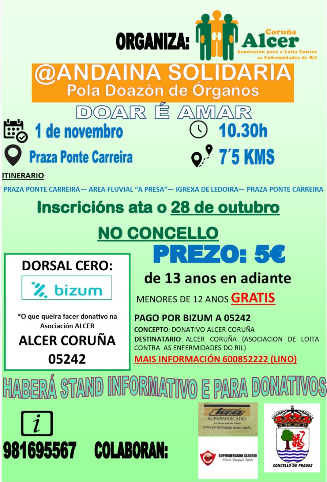 A asociación para a loita contra o cancro e enfermidades do ril Alcer Coruña organiza unha andaina solidaria pola doazón de órganos, que terá lugar o sábado 1 de novembro, ás 10:30 horas, en Frades. As inscricións están abertas ata o 28 de outubro no Concello de Frades: 981 695 567 (en horario de mañá) e 600 852 222 (Lino Espiñeira).
