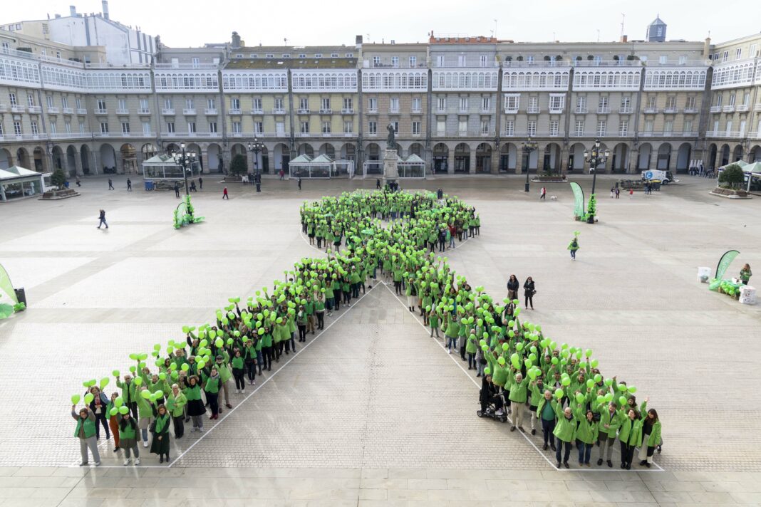 A praza de María Pita acolleu esta mañá o acto conmemorativo polo Día Mundial contra o Cancro, unha iniciativa promovida pola Asociación Española contra o Cancro (AECC) e na que a alcaldesa, Inés Rey, tomou parte no gran lazo humano verde, de carácter solidario, conformado hoxe en apoio ás persoas que padecen a enfermidade.