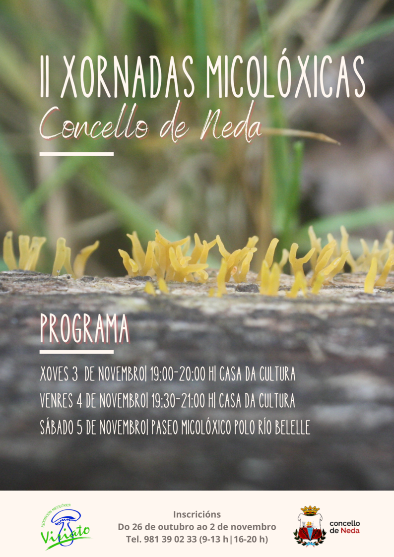 O Concello de Neda e a Asociación Viriato volven a aliarse na organización das II Xornadas Micolóxicas. Celebraranse do xoves 3 de novembro ao sábado 5 de novembro, con participación de balde e inscrición previa de forma presencial na casa da cultura ou teléfono 981 39 02 33 de 9 a 13 e de 16 a 20 h, dende hoxe e ata o 2 de novembro -ou esgotar prazas-.
