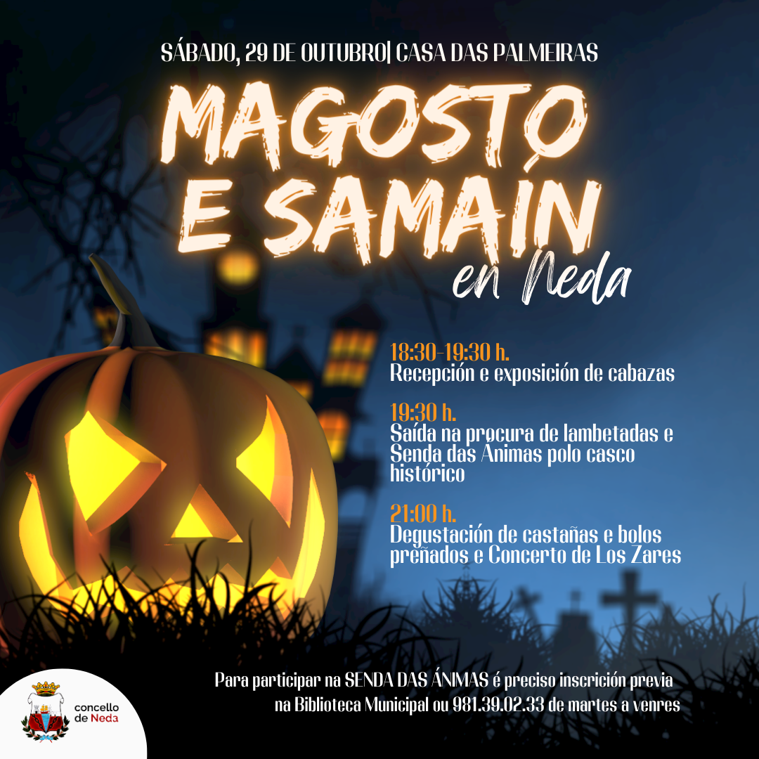 O Concello de Neda está de celebración por partida doble este sábado 29 de outubro. A uns días da festividade de Defuntos e Todos os Santos, e cunhas xornadas festivas por diante, convida a nenos e nenas, mozos e mozas e maiores a festexar o Samaín e o Magosto. A Casa das Palmeiras será o epicentro da celebración. Alí, a partir das 18:30 horas, a veciñanza poderá achegarse coas súas cabazas para participar nunha exposición colectiva que terá premios para os máis pequenos e pequenas da casa. Así, entre todos eles, sortearanse tres lotes de libros.