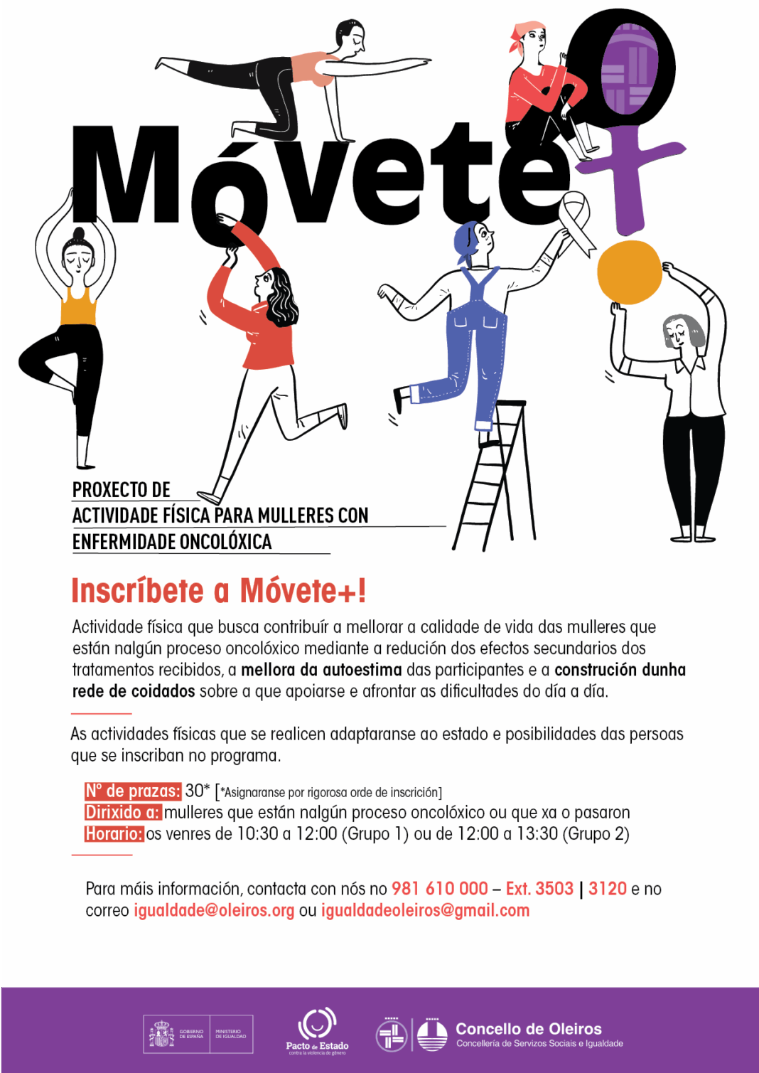 Calquera muller de Oleiros con enfermidade oncolóxica pode participar cada venres nunha sesión de actividade física que ten lugar na Casa da República, denominada Móvete+, para o que poden inscribirse nun formulario ao que se accede a través da xanela de Servizos Sociais da web municipal.