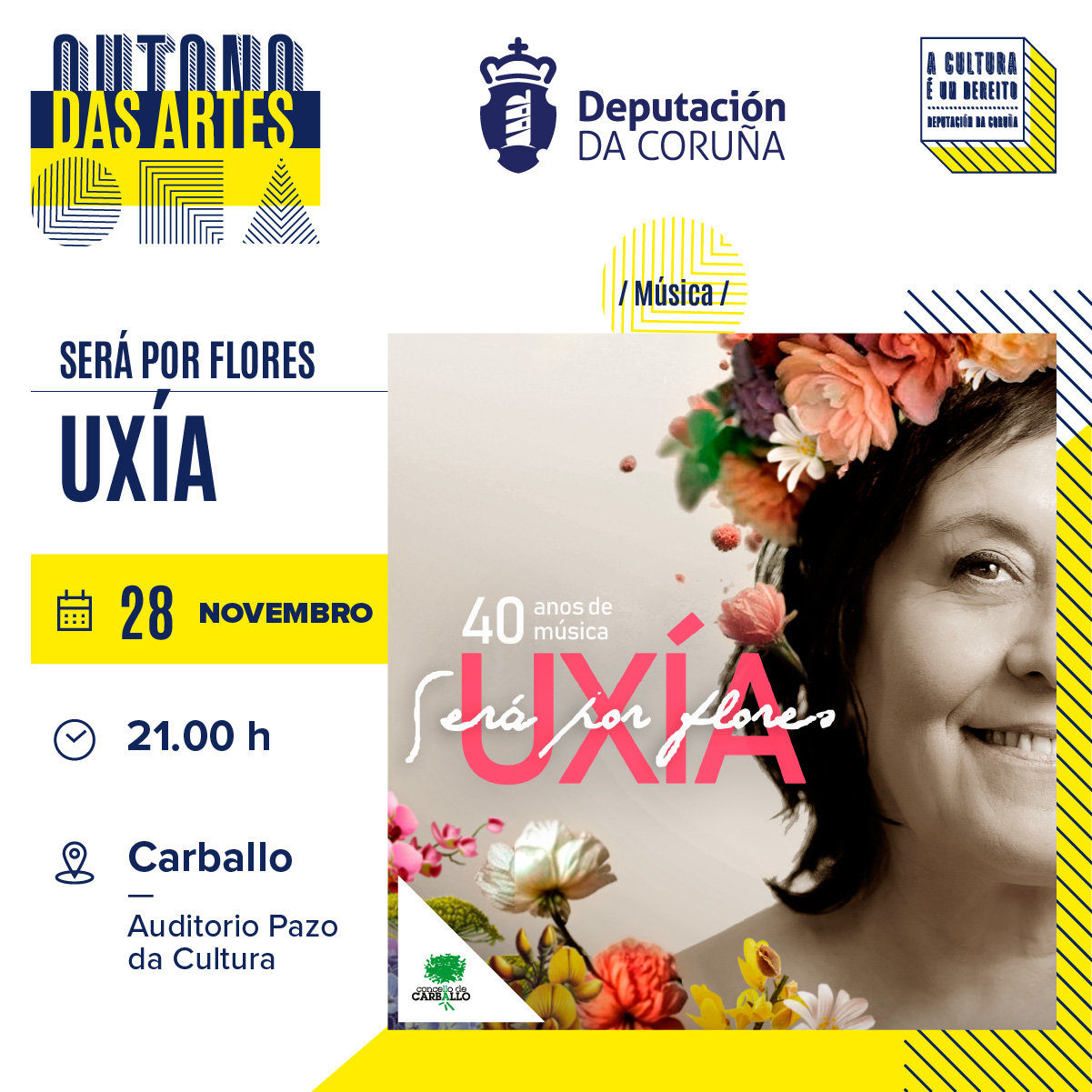 O peche do programa chega o venres 28 con Uxía, que presenta Uxía, será por flores. A coñecida cantante galega celebra catro décadas de carreira cun espectáculo único e intimista, onde re visita os piares do seu percorrido musical e continúa explorando novas formas con liberdade creativa. O concerto é unha viaxe polas súas raíces galegas, composicións propias e músicas que a inspiraron. A súa diversidade reflicte os innumerables camiños que percorreu, sempre en constante evolución e transformación. A cita é ás 21.00 horas no Pazo da Cultura e está organizada coa colaboración da Deputación da Coruña.