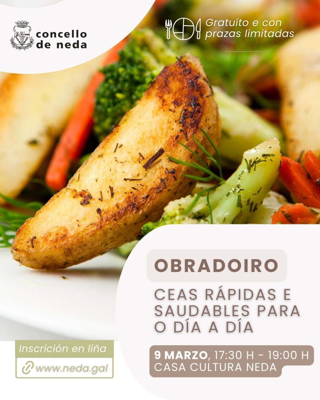 O Concello de Neda organiza, no marco das súa programación de actividades de saúde, un obradoiro práctico, centrado na preparación de “Ceas rápidas e saudables para o día a día”. A iniciativa, impartida pola nutricionista Almudena Seijido, terá lugar o luns 9 de marzo e dende hoxe abre a inscrición en liña. As prazas son limitadas.
