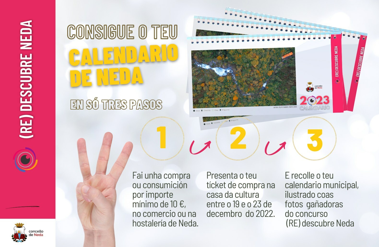 O Concello de Neda activa a próxima semana, no marco da campaña (RE)descubre Neda, unha acción promocional coa que premiará á clientela do comercio e a hostalería locais. Regalará 300 calendarios de sobremesa, ilustrados coas imaxes gañadoras do concurso fotográfico convocado recentemente, ás 300 primeiras que o demanden, e acrediten ter realizado un gasto mínimo nos negocios da vila.