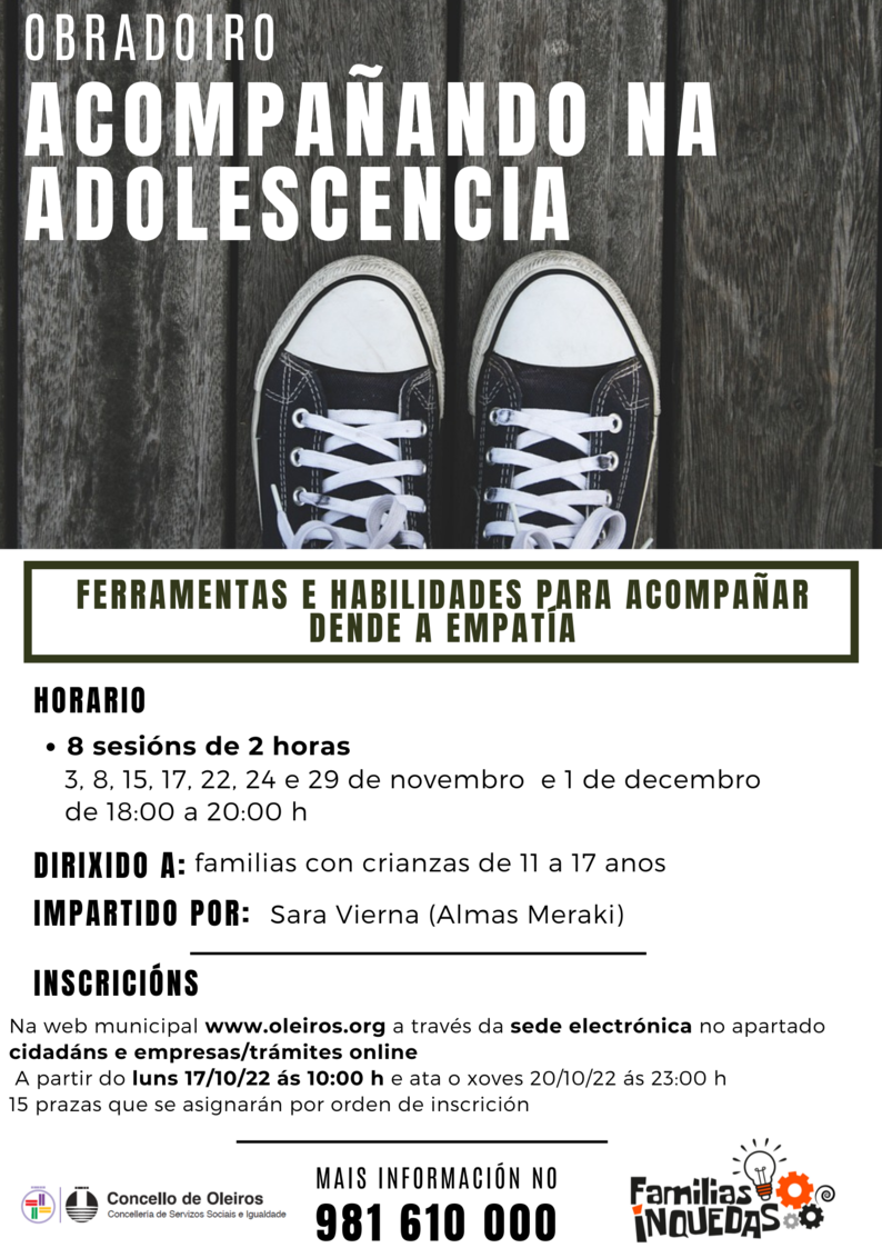 O Obradoiro “Acompañando á adolescencia” está dirixido a familias veciñas de Oleiros con menores de 11 a 17 anos de idade. As sesións serán nas seguintes datas: 3, 8, 15, 17, 22, 24 e 29 de novembro e o 1 de decembro en horario de 19:00 a 21:00 h.