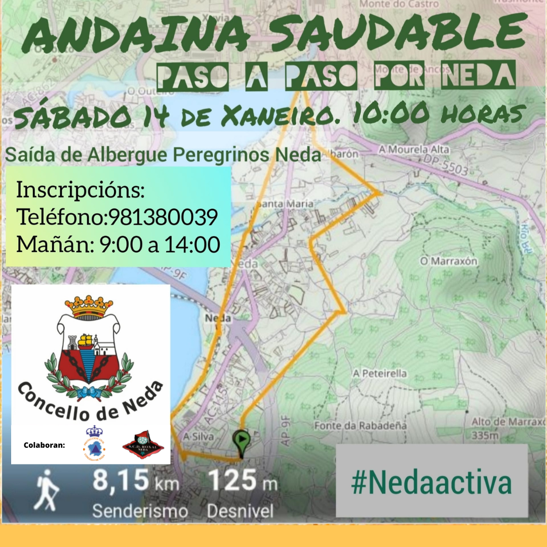O Concello poñerá en marcha ao longo dos vindeiros meses o programa Andainas Saudables, paso a paso por Neda. Rutas con carácter mensual por diferentes espazos do municipio cos que fomentar hábitos saudables a través da práctica deportiva. A primeira delas celebrarase o vindeiro sábado 14 de xaneiro, con saída do Albergue de Peregrinos ás 10:00 horas. Cunha distancia a cubrir de 8,15 quilómetros, trátase dun itinerario circular de dificultade media-baixa, para persoas a partir de 13 anos, que discorrerá, entre outros puntos, polo paseo marítimo e a zona do Puntal.