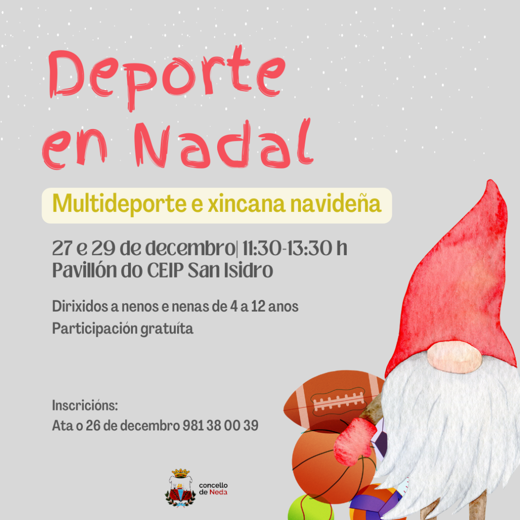 O Concello abre inscricións nas xornadas Deporte en Nadal que celebrará a vindeira semana para nenos e nenas de Neda de entre 4 e 12 anos. Dúas xornadas, o martes 27 e o xoves 29 de decembro, cargadas de