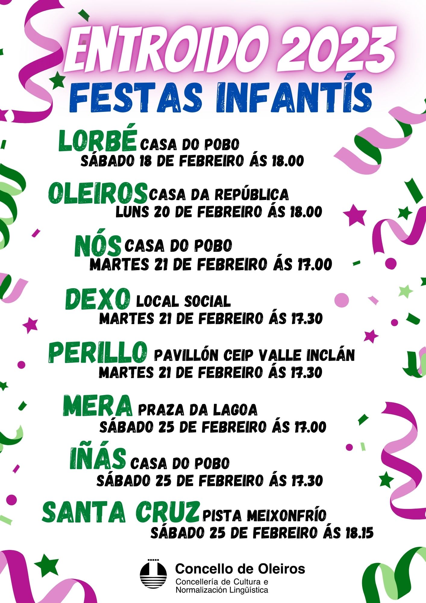 Ademais da festa de Entroido que organiza o Concello, as diferentes entidades sociais celebrarán festas de Entroido en espazos públicos das súas respectivas localidades. Para colaborar, o Concello contratará un grupo de animación infantil para cada un destes eventos.