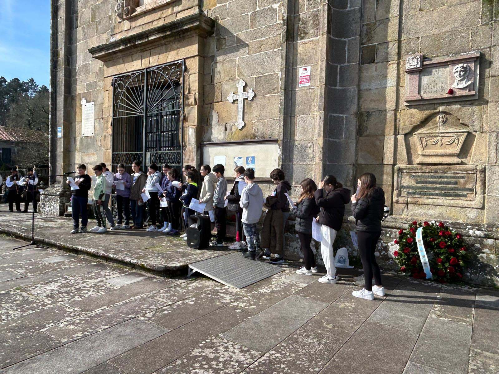 A igrexa parroquial de San Xulián de Bastavales acolleu esta mañá a tradicional ofrenda floral do Concello de Brión á Rosalía de Castro na que participaron máis dun cento de persoas, na súa maioría rapazada procedente do IES de Brión e do CEIP de Pedrouzos. A xornada abriuse cun toque de campás da man do campaneiro de Bastavales, lembrando que unhas campás semellantes foron as que inspiraron os famosos versos do libro “Cantares Gallegos”, se ben as campás non son as mesmas, xa que a veciñanza tivo que cambialas a mediados do século pasado.