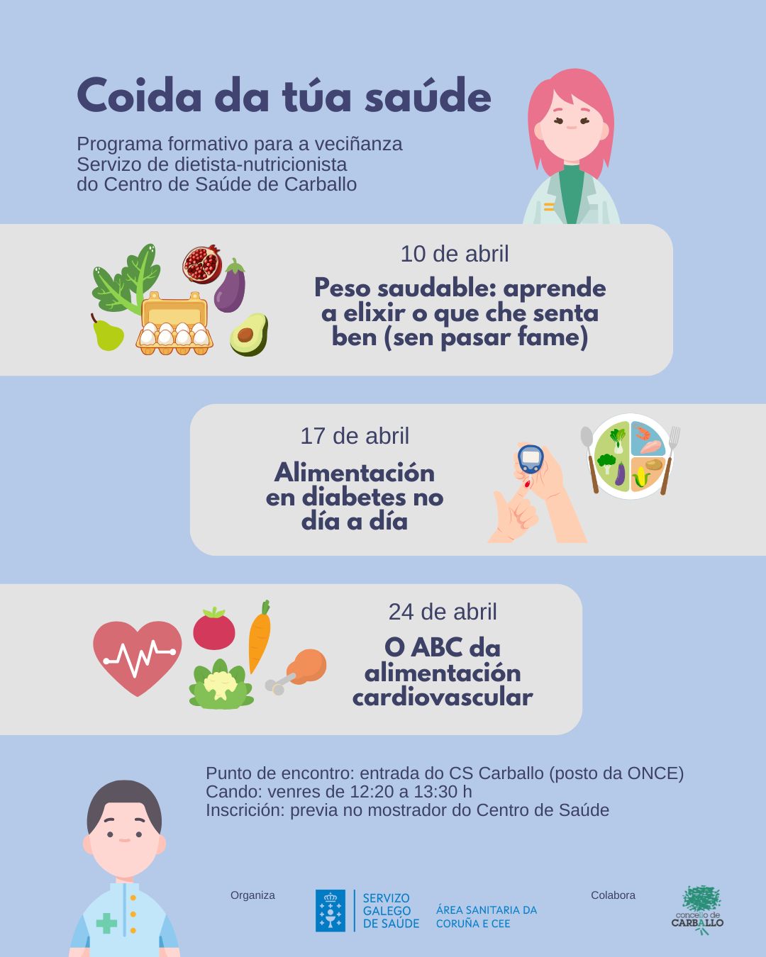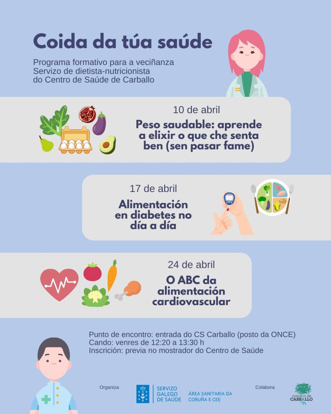 O Centro de Saúde de Carballo, a través do seu servizo de dietista-nutricionista, pon en marcha o programa formativo “Coida da túa saúde”, unha iniciativa dirixida á veciñanza co obxectivo de promover hábitos de vida saudables a través da alimentación.