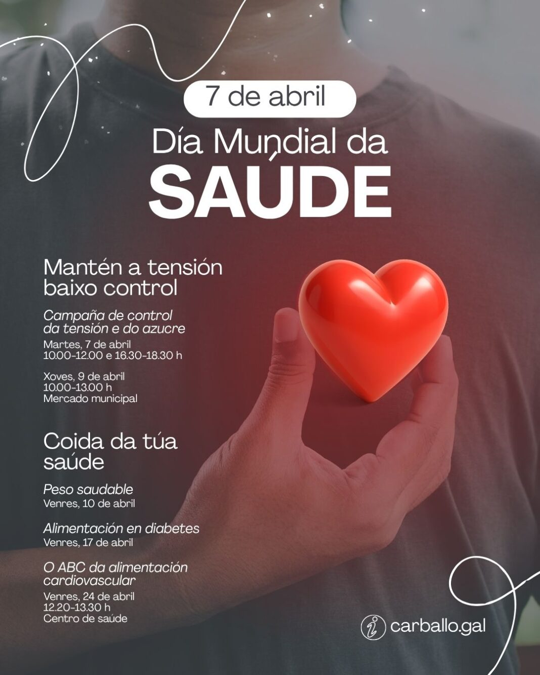 Cun enfoque preventivo e co obxectivo de fomentar hábitos de vida saudables, Carballo celebra o Día Mundial da Saúde cunha dobre acción dirixida a toda a veciñanza. A estratexia combina a atención directa na rúa coa formación especializada de mans de profesionais da nutrición.