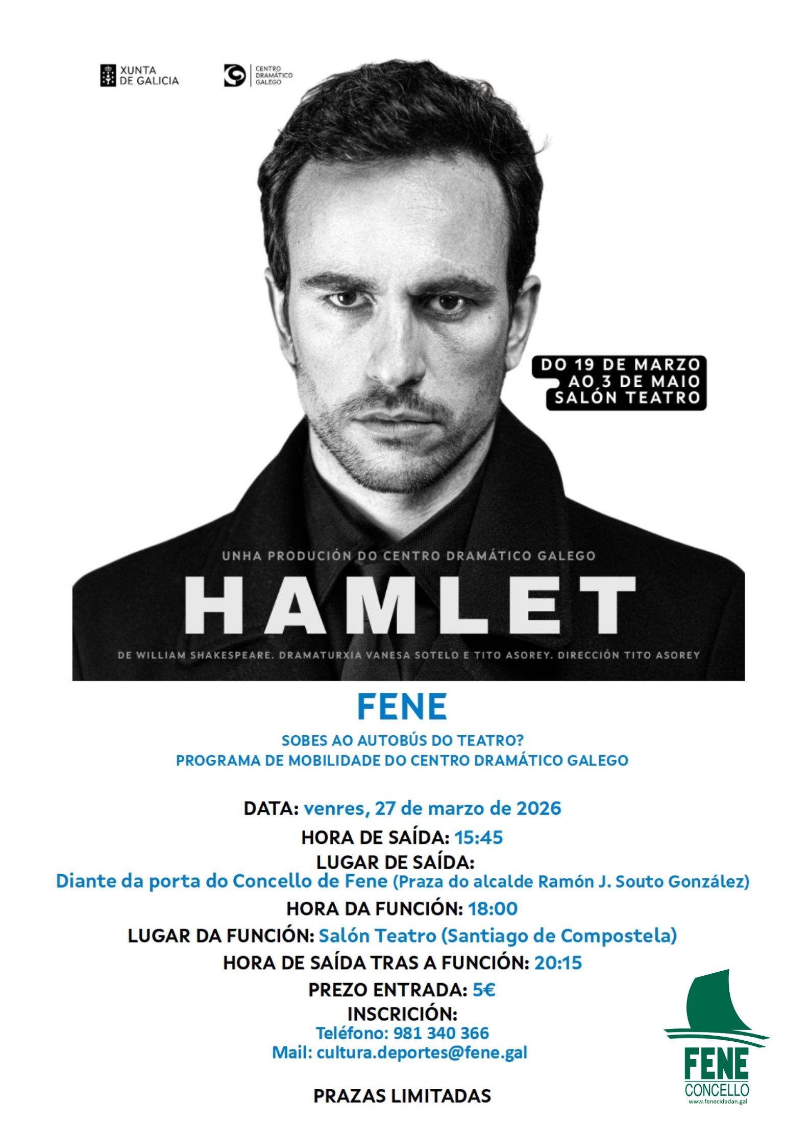 O Centro Dramático Galego pon a disposición do Concello de Fene 17 prazas de autobús para asistir a unha representación da obra Hamlet no Salón Teatro de Santiago. A cita para os/as veciños/as do noso concello será o venres 27 de marzo, con saída ás 15.45 horas da Avda. do Concello e retorno aproximado sobre as 20.15/20.30 horas. O comezo da función está previsto para as 18.00 horas e o prezo da entrada ascende a 5 euros (autobús de balde).