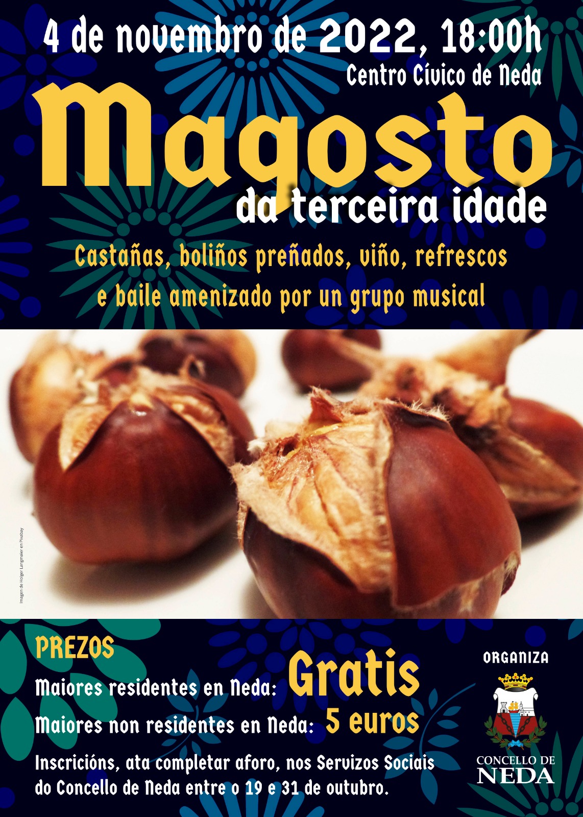 O Concello de Neda informou esta mañá de que este mércores abre o prazo de inscrición para participar na festa do Magosto para a Terceira Idade. A cita celebrarase o venres 4 de novembro a partir das 18:00 horas no centro cívico Ramón Millarengo, e nela non faltará a degustación de castañas, boliños preñados, viño e refrescos, así como un gran baile amenizado por un grupo con música en directo.