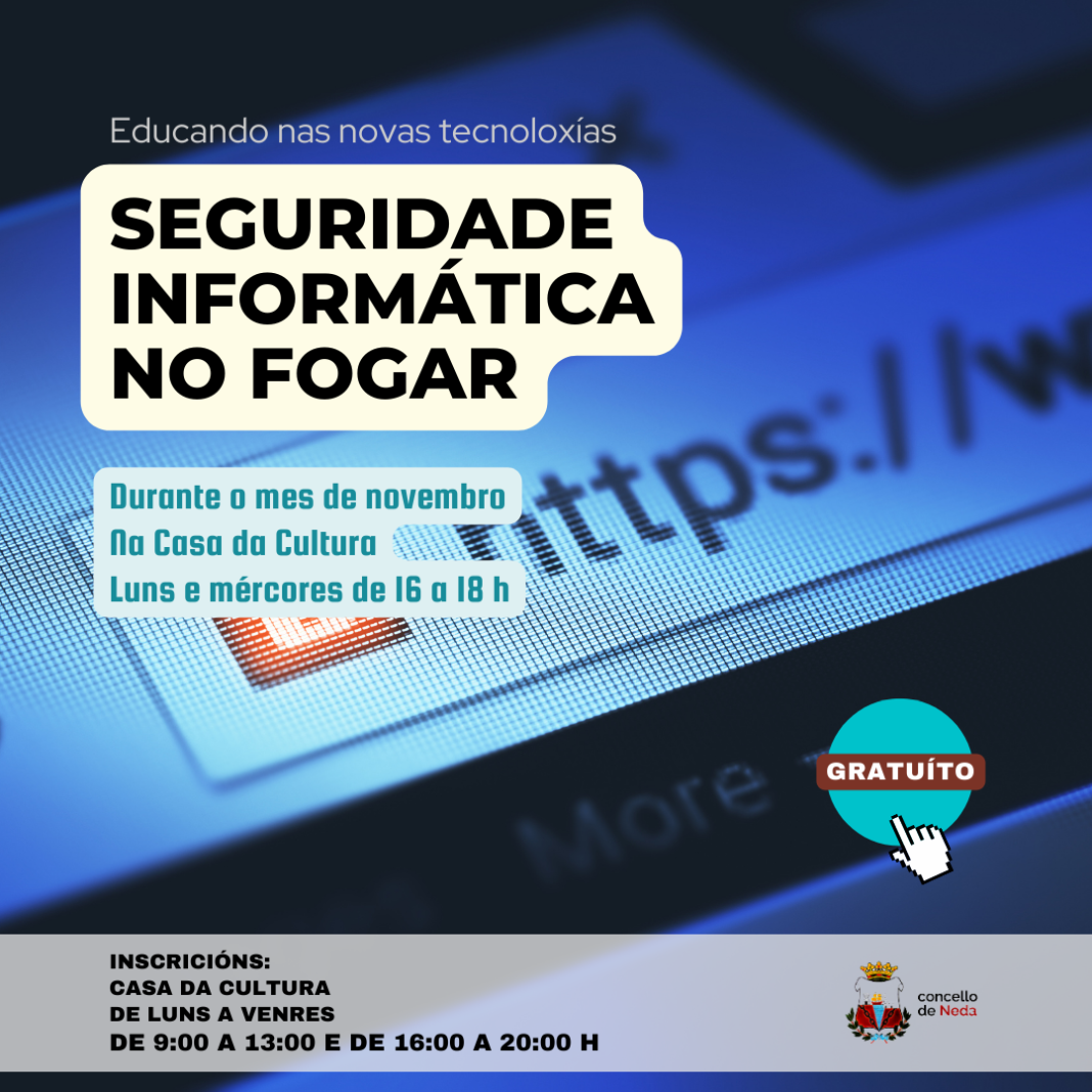 O Concello de Neda impartirá un curso de seguridade informática no fogar aberto a todos os veciños e veciñas do municipio. As sesións desenvolveranse todos os luns e mércores do mes de novembro na casa da cultura, en horario de 16:00 a 18:00 horas, e o prazo para apuntarse ábrese hoxe, ata o 24 de outubro, na casa da cultura -de 9:00 a 13:00 horas e de 16:00 a 20:00 h-.