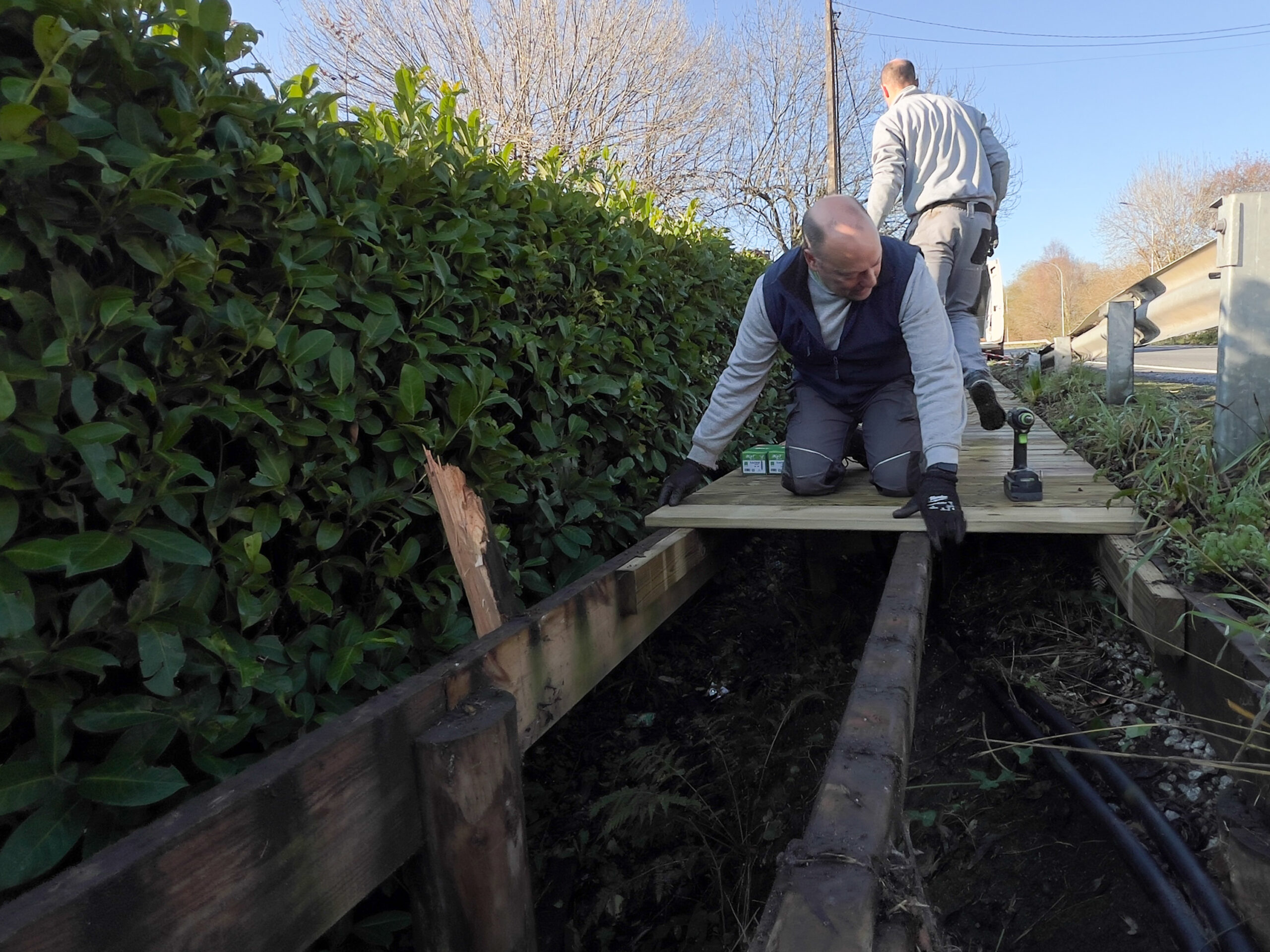 Traballadores da empresa de carpintaría Manuel Lema están traballando durante estes días á beira da estrada de Ortigueira ao seu paso por Cornide para amañaren os arredor de 30 metros de pasarela de madeira que se viron afectados pola saída de vía dun vehículo hai dous meses. Dase a circunstancia de que o taboado, que conecta coa ponte sobre o Xubia, imprescindible para cruzar o río a pé nese punto da AC-862. Os traballos están orzamentados en 3.800 euros, impostos incluídos, que o Concello de San Sadurniño lle trasladará á aseguradora do coche.