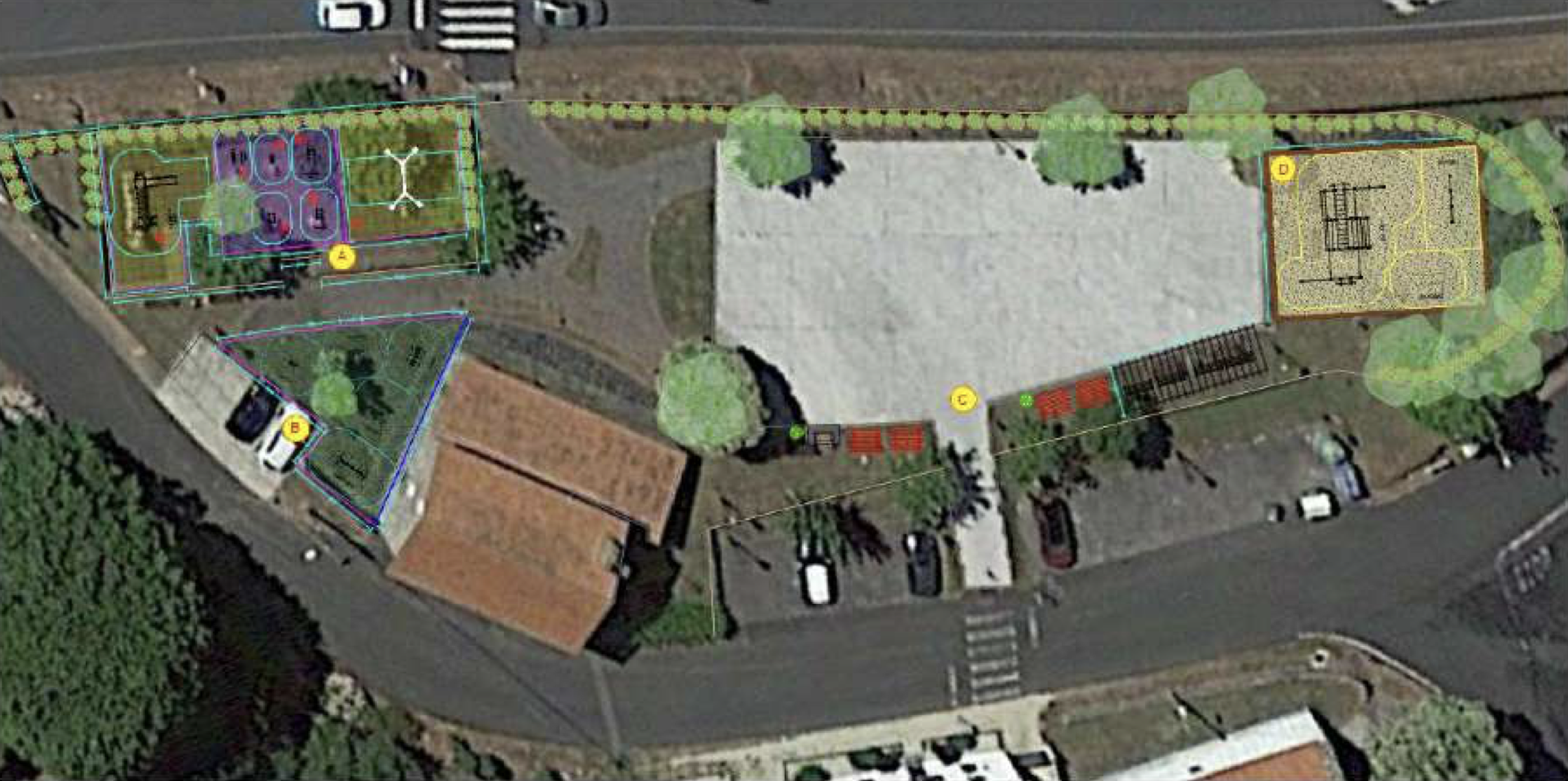 Por outra banda, acondicionarase a intersección de dous viais na contorna do cemiterio, mellorando o aparcamento existente e proporcionando un espazo urbanizado accesible nesta zona. Neste caso, debido á súa maior afluencia e co obxectivo de acougar o tráfico rodado, dispoñerase dun pavimento de lastra prefabricada sobreelevado.