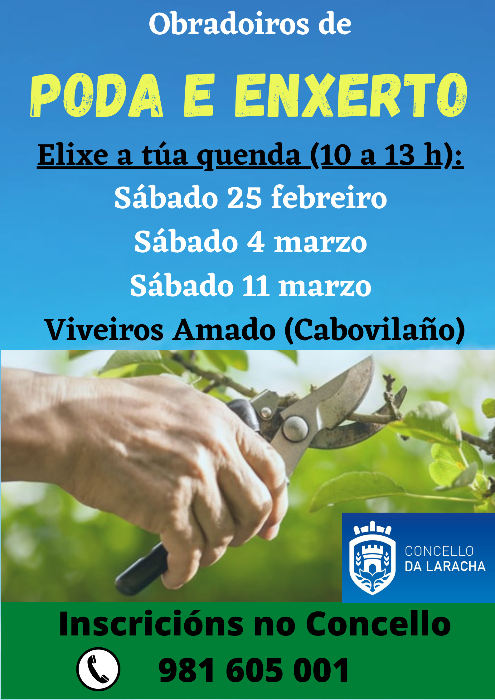 O Concello organiza os obradoiros de poda e enxerto de árbores froiteiras que se van realizar os sábados 25 de febreiro e 4 e 11 de marzo en horario de 10:00 a 13:00 horas nas instalacións de Viveiros Amado, situadas no lugar de A Braña Grande (parroquia de Cabovilaño), a carón da estrada AC-552.