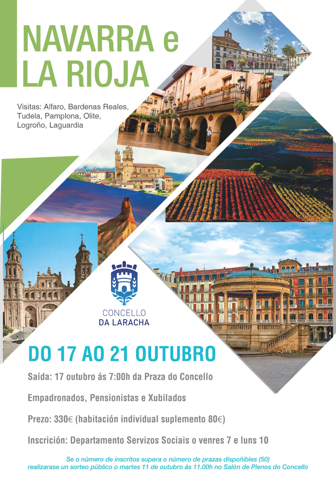 A viaxe realizarase entre o 17 e o 21 de outubro. No primeiro día o autobús partirá ás 7:00 horas desde a Praza do Concello, sendo o punto de destino a localidade rioxana de Alfaro, lugar no que se aloxarán durante a excursión. O martes 18 están previstas visitas ao Parque Natural das Bardenas Reales, lugar no que se rodaron escenas da serie Juego de Tronos, e a Tudela, a capital da ribeira navarra. O mércores 19 faranse visitas guiadas pola cidade de Pamplona e no Castelo de Olite. O xoves 20 os destinos serán Logroño e Laguardia, localidade da Rioxa Alavesa na que visitarán unha bodega subterránea. O venres 21 será a viaxe de regreso.