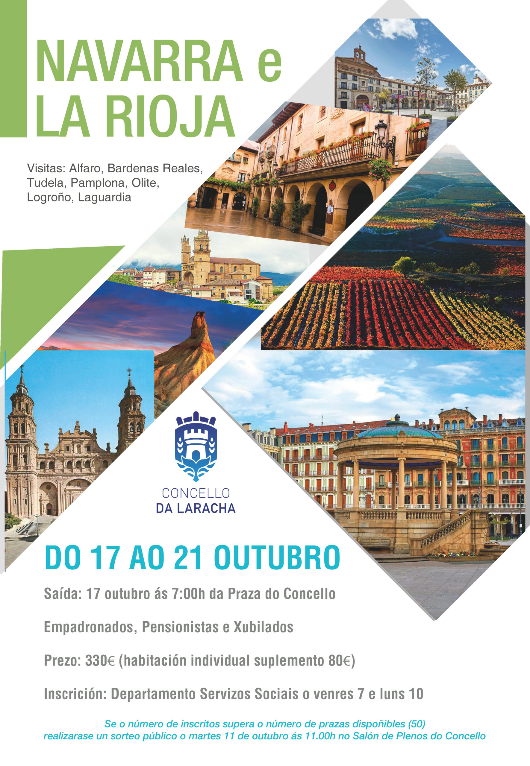 O Concello organiza unha nova excursión dirixida a persoas maiores de 60 anos de idade, xubiladas e pensionistas que contempla nesta ocasión visitas a diferentes localidades de Navarra e A Rioxa. O obxectivo é ofrecerlle a ese colectivo unha proposta cultural e recreativa para o aproveitamento do seu tempo libre que lles permita coñecer esa zona do norte de España e evitar a exclusión social.