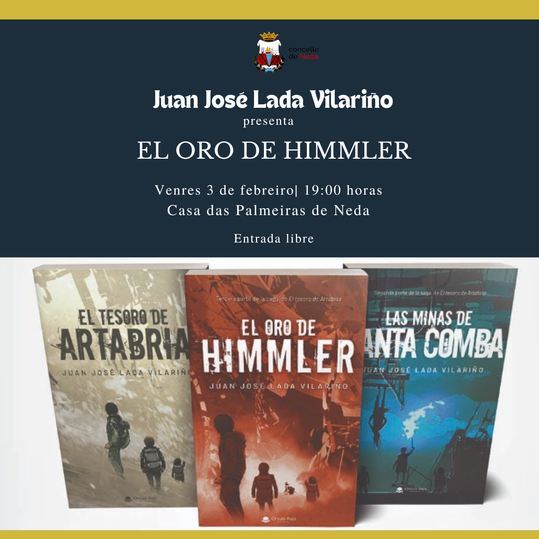 O escritor Juan José Lada Vilariño presentará estevenres na Casa das Palmeiras de Neda a súa útima obra, “El oro de Himmler”, coa que o autor completa a súa saga “El tesoro de Artabria”. O acto dará comezo ás 19:00 horas con entrada libre, e nel, o escritor avanzará algunhas claves da súa novela, e asinará exemplares ao remate.