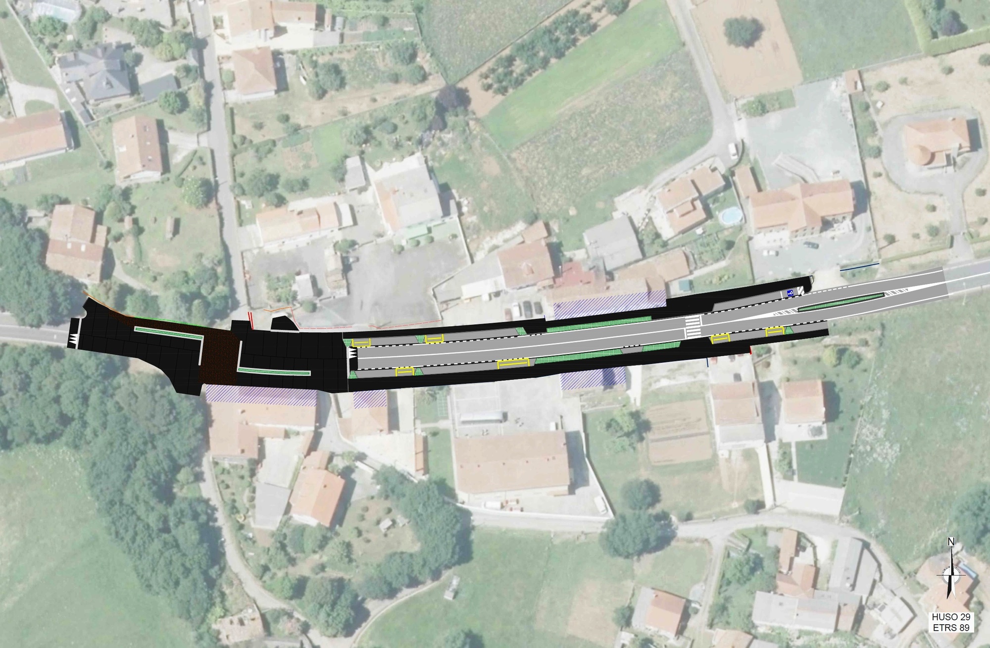Establécense dúas zonas de actuación, marcadas polo cruzamento do Camiño de Santiago. Nos primeiros 175 metros proxéctase unha sección con calzada pavimentada de 6,4 metros de ancho mais beirarrúas en ambas marxes, con alternancia de zonas verdes e prazas de aparcamento. Nos últimos 85 metros proxéctase un área de convivencia para peóns e vehículos, executada cunha plataforma única de formigón, e a cal estará cortada por un pavimento de formigón desactivado no paso do Camiño de Santiago.
