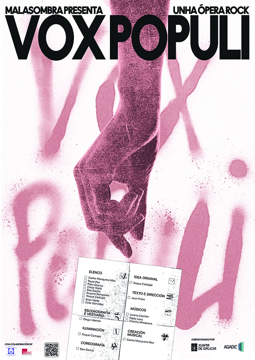 A estrea da obra de teatro musical “Vox Populi”, da compañía Malasombra Producións, terá lugar mañá ás 20.30 horas no Pazo da Cultura. A representación da primeira ópera rock de Galicia, cun texto e dirixida polo naronés José Prieto, poderase ver tamén o sábado ás 20.00 horas no Pazo. O prezo das entradas, que se poden adquirir no despacho de billetes do Pazo e na web do Padroado da Cultura –www.padroadodecultura.es- é de 9,50 euros para o público xeral e de 6,65 para aboados, desempregados e persoas con carné xove ou de estudante (ata 25 anos).