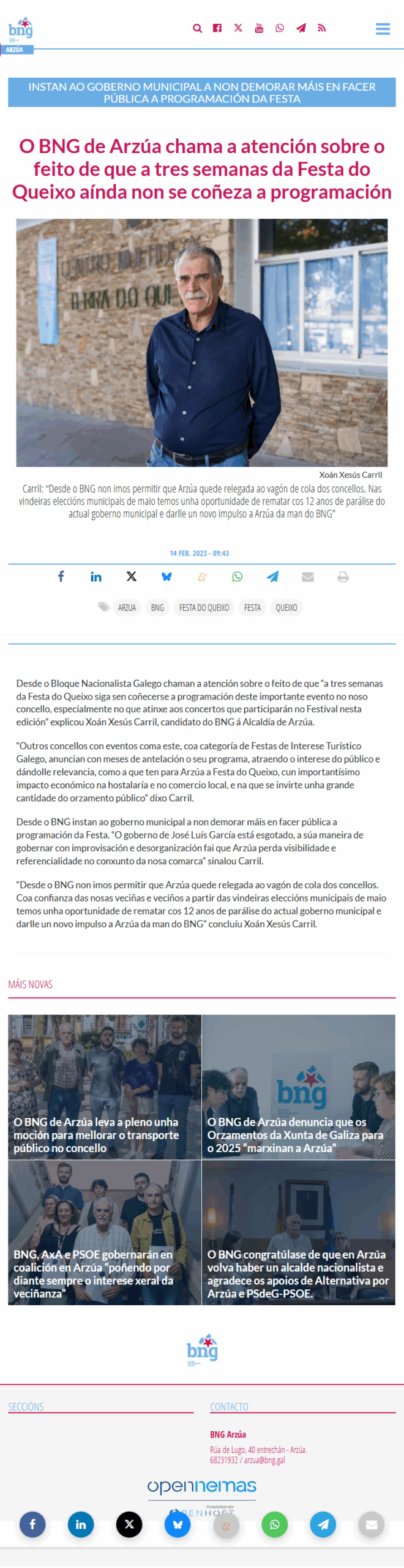 Finalmente, o PP de Arzúa expresa a súa preocupación pola posibilidade de que “a deriva ideolóxica do BNG e a súa política do non a todo volvan ter protagonismo na Festa do Queixo”, como xa aconteceu de forma lamentable durante os concertos e o pregón de 2025. “A Festa do Queixo debe unir, promocionar Arzúa e apoiar ao sector, non converterse nun escaparate ideolóxico nin nun espazo alleo aos intereses dos veciños”, concluíu Rafael Rivadulla.