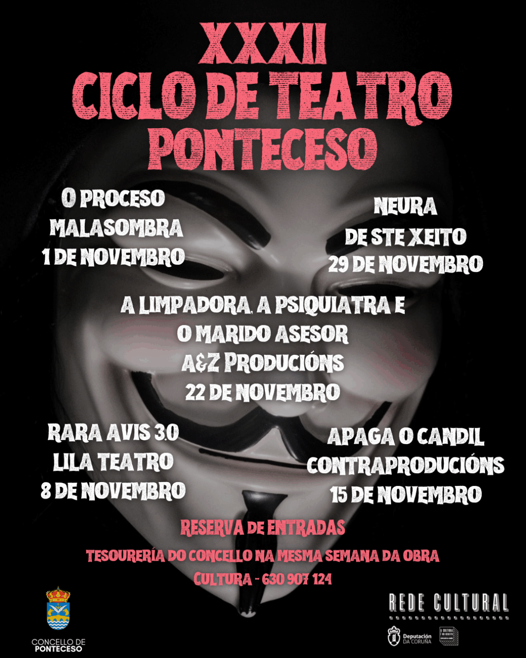 O Concello de Ponteceso presenta unha nova edición do seu xa consolidado Ciclo de Teatro, que este ano alcanza a súa XXXII edición, un dos máis lonxevos da provincia da Coruña e un referente cultural na Costa da Morte. Durante os sábados do mes de novembro, o Edificio das Escolas, sempre ás 22:00 horas, converterase nun espazo de encontro co mellor teatro galego contemporáneo, ofrecendo cinco propostas diversas que combinan comedia, reflexión e crítica social.