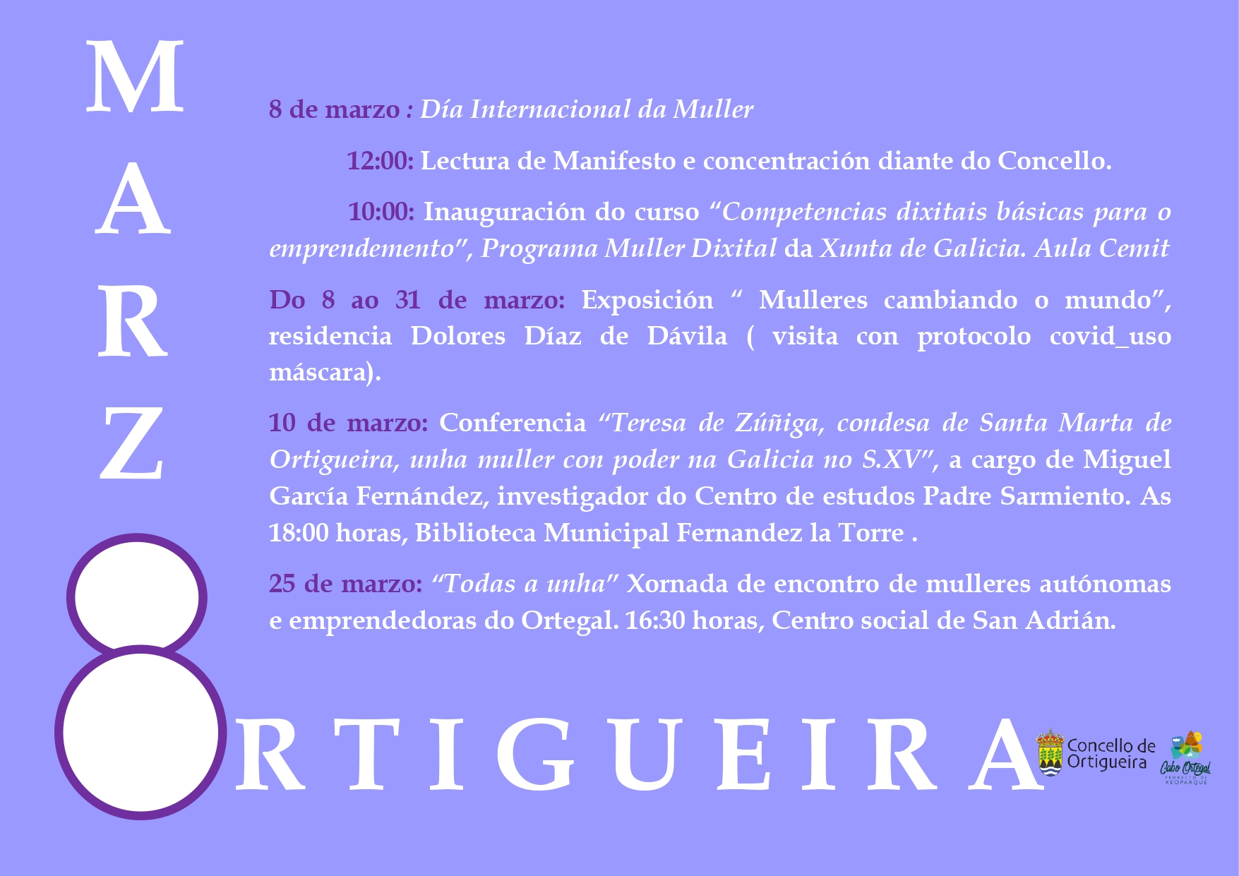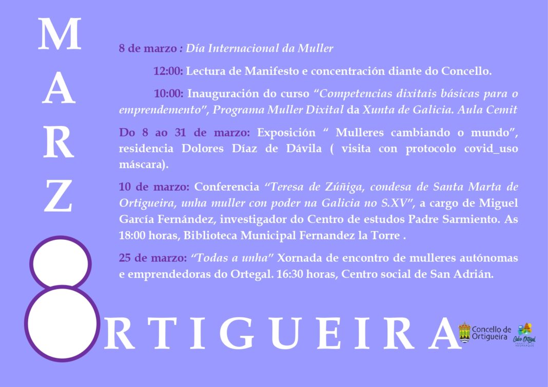 O Concello de Ortigueira, a través do Centro de Información á Muller, prepara unha extensa programación de actividades durante todo o mes de marzo para conmemorar o 8M, Día Internacional da Muller.